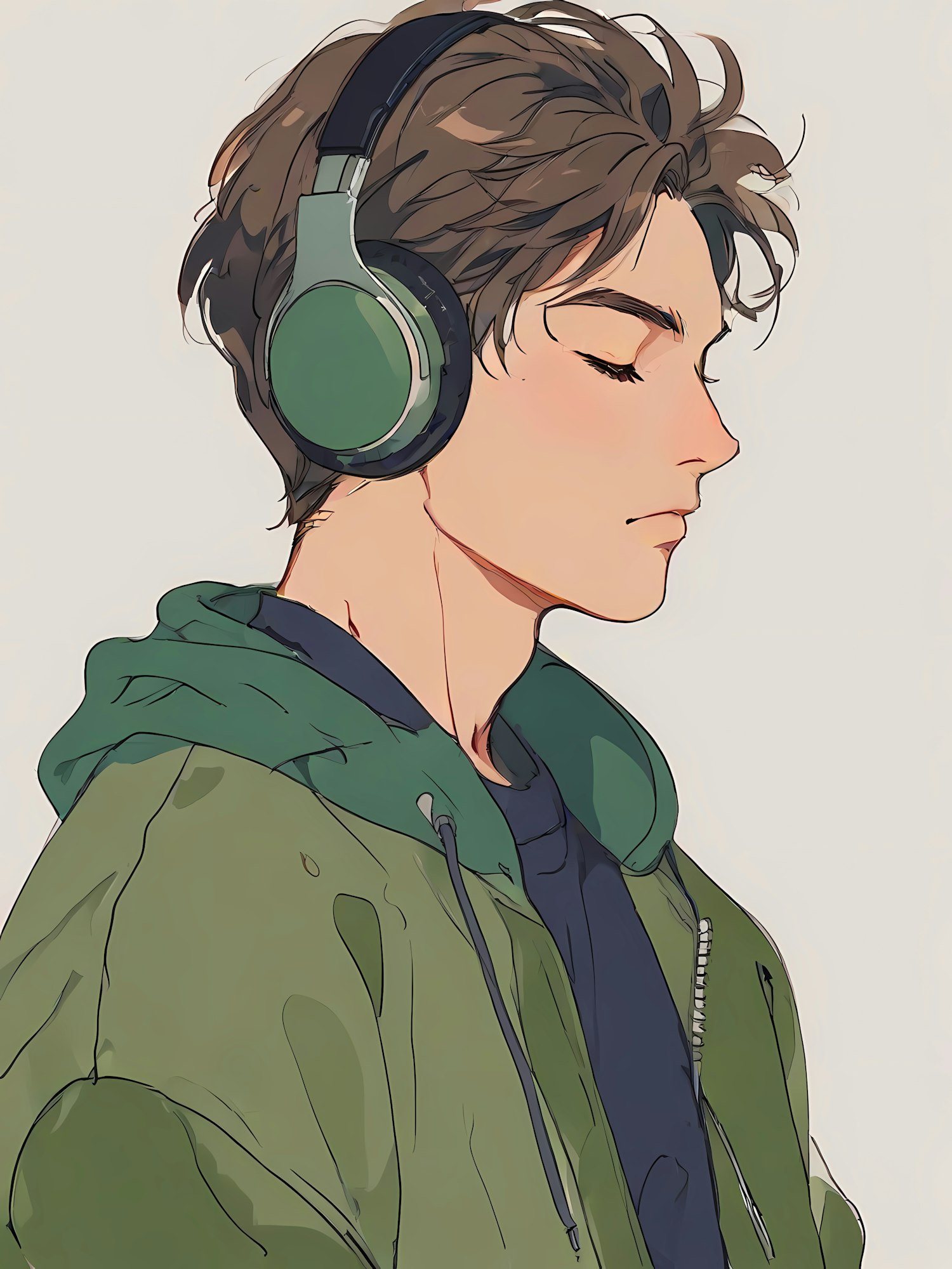 Stylized illustration of a young man with green headphones, brown hair, and a green hoodie, lost in thought with a calm expression.