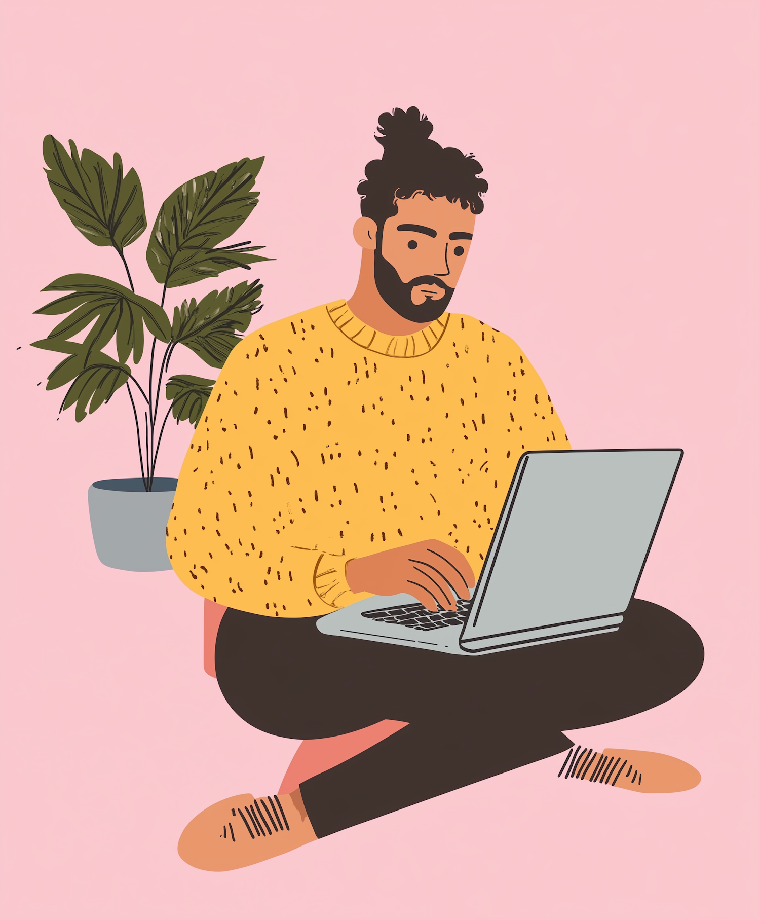 Illustration of a man with a bun and beard working on a laptop, wearing a yellow sweater, with a plant in the background.
