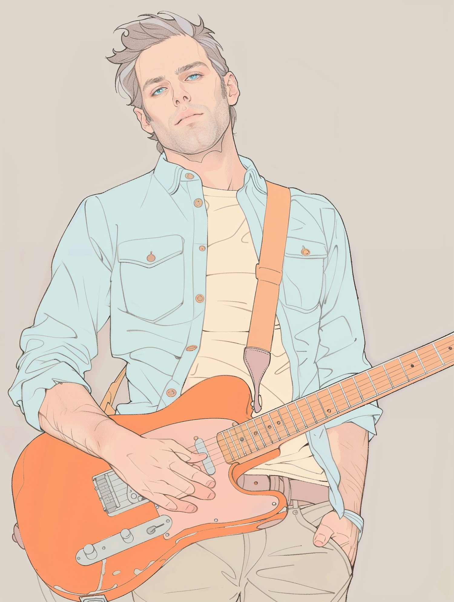 Stylized illustration of a man with blue eyes holding an orange electric guitar, wearing a light blue shirt and beige t-shirt.
