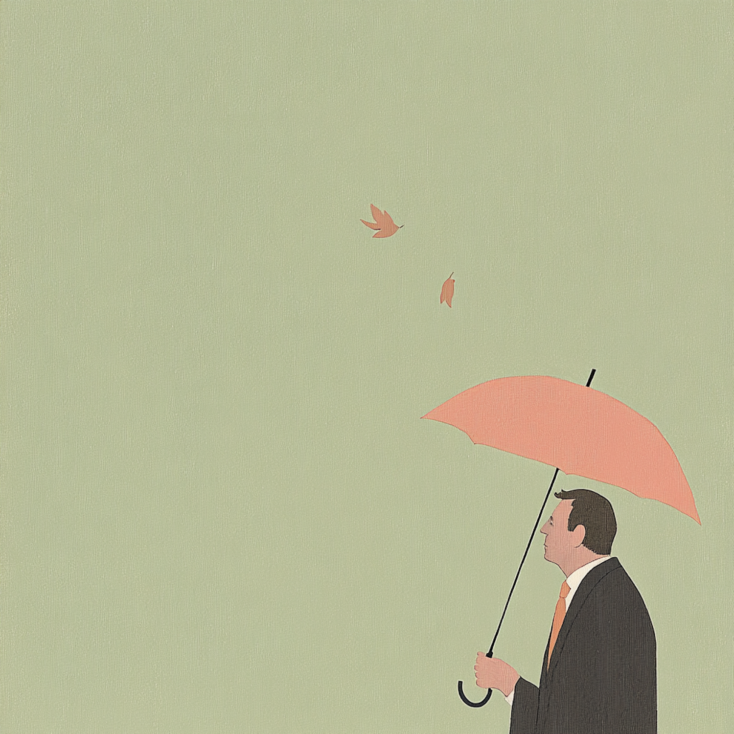 Minimalist illustration of a man in a suit holding a pink umbrella, with birds flying against a muted green background.