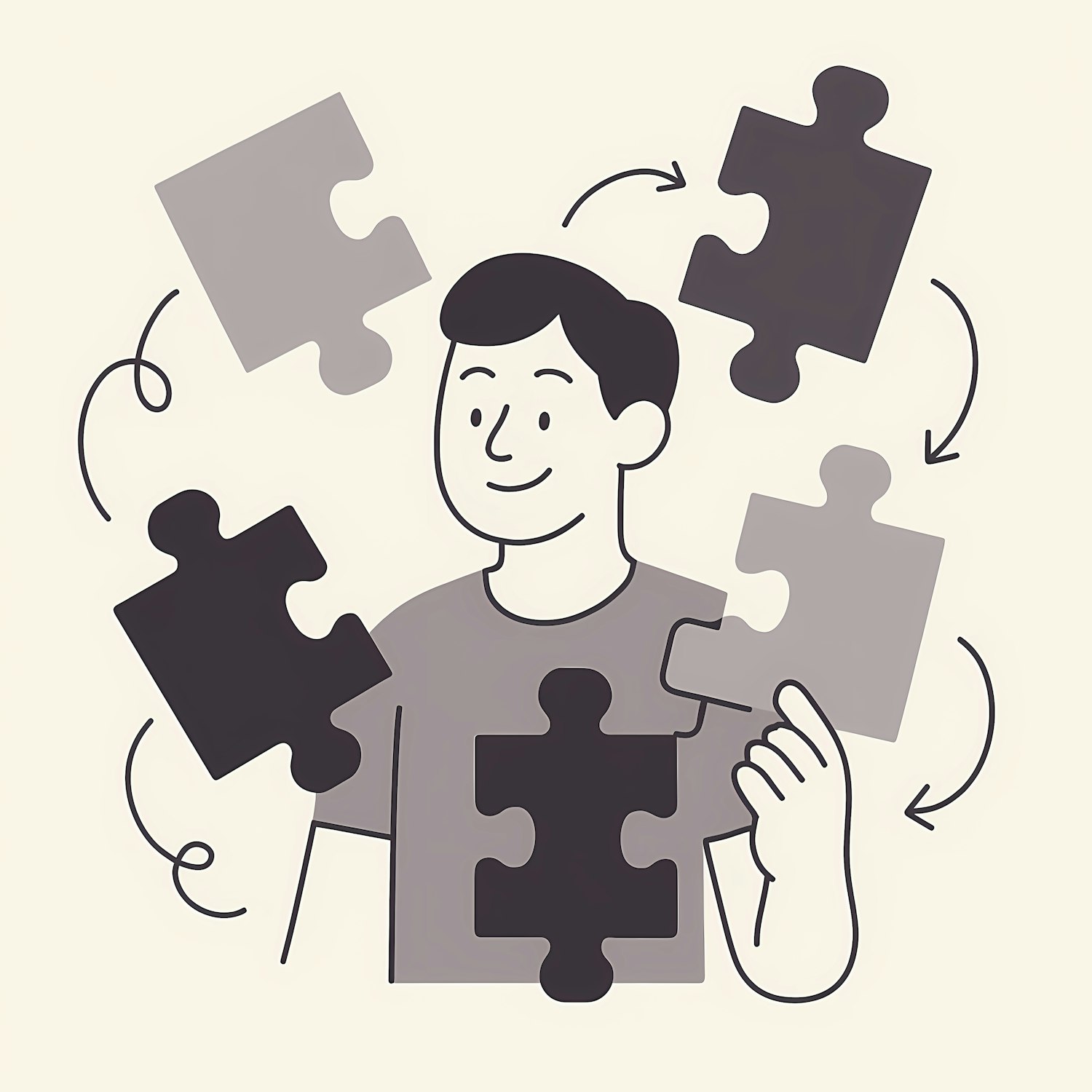 Minimalist illustration of a man holding a puzzle piece, surrounded by floating pieces, symbolizing problem-solving or self-discovery.