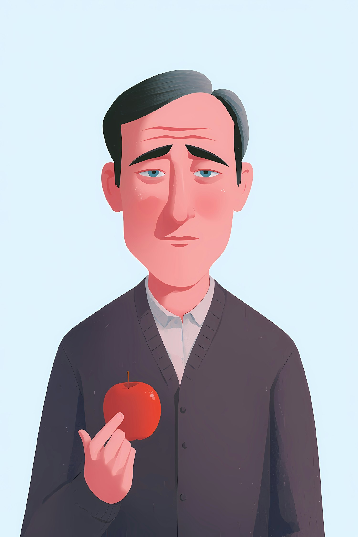 Stylized illustration of a man holding a red apple, wearing a dark cardigan and white shirt, set against a light blue background.
