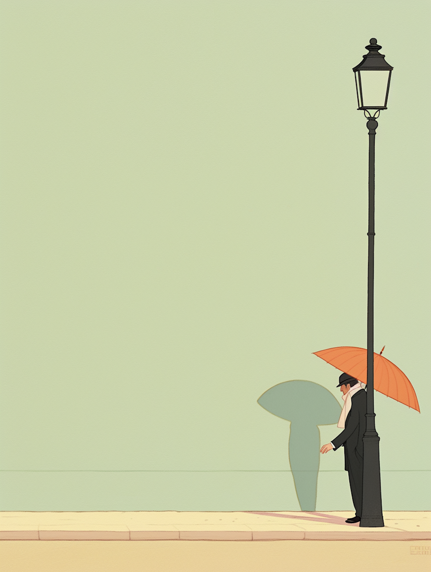 Minimalist illustration of a man with an orange umbrella casting a mushroom-shaped shadow on a pale green wall, next to a streetlamp.