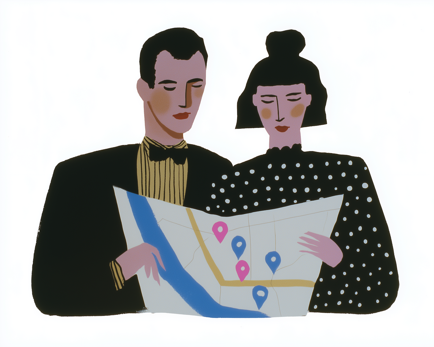 Stylized illustration of a man and woman in formal attire examining a map with location markers, set against a plain white background.