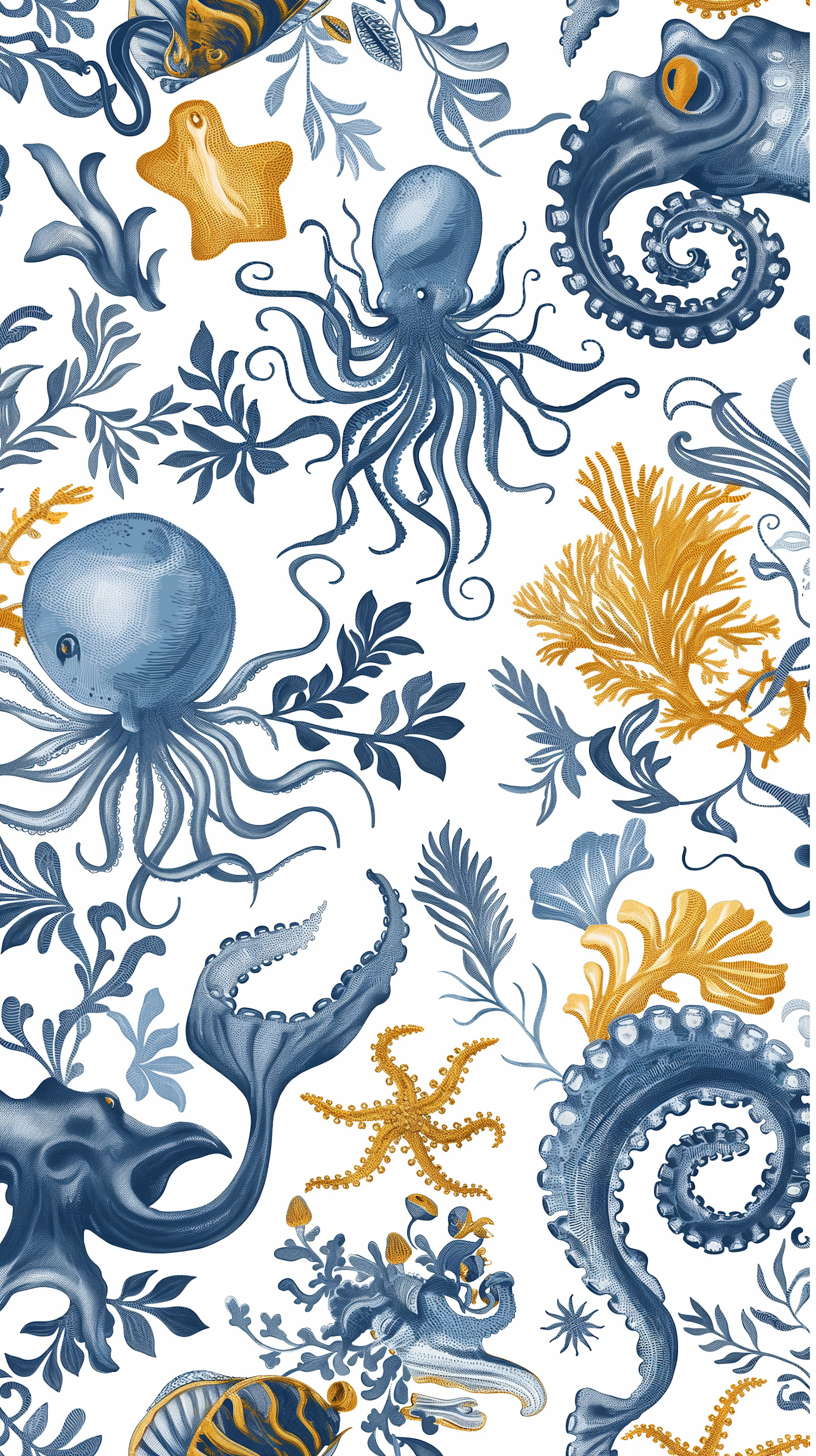 Intricate marine-themed illustration with octopuses, starfish, and sea plants in blue and gold hues on a white background.