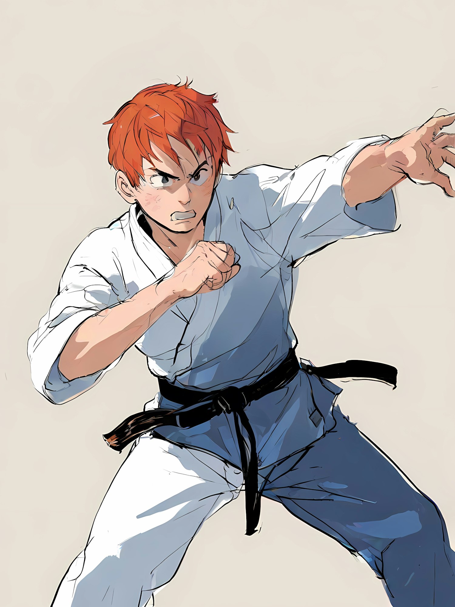 Dynamic illustration of a red-haired martial artist in a white gi and black belt, striking a powerful pose with intense focus.
