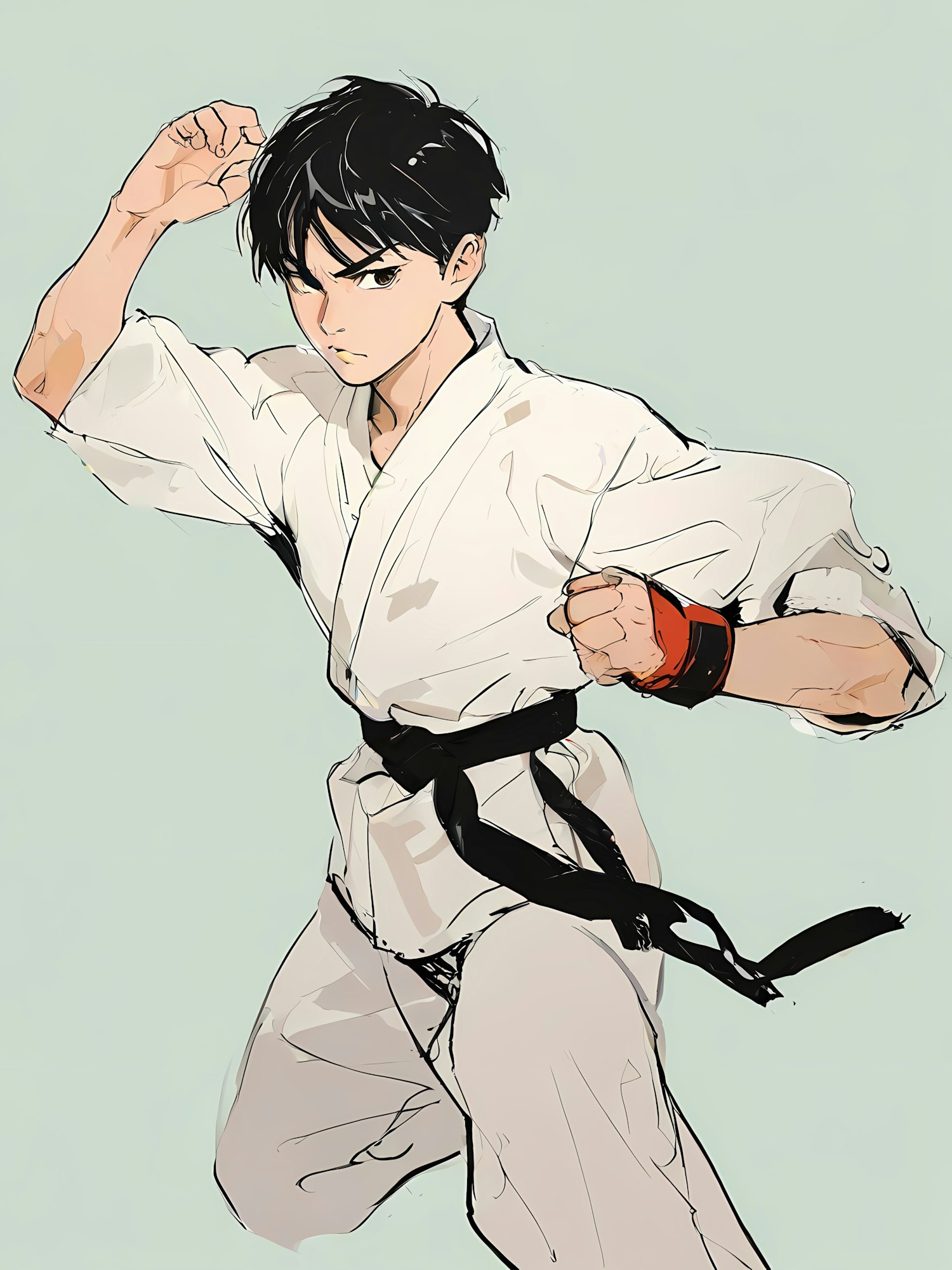 Dynamic illustration of a martial artist in a karate gi, showcasing a powerful stance and focused expression.