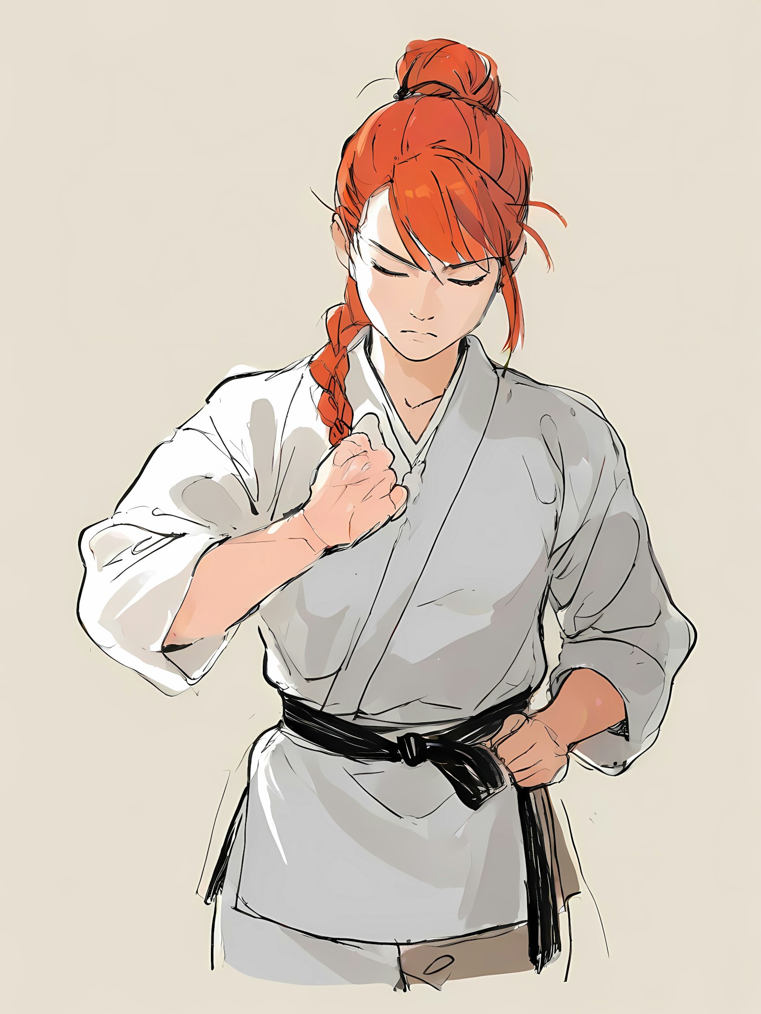 Illustration of a red-haired martial artist in a gi, showcasing strength and focus with a black belt and determined expression.