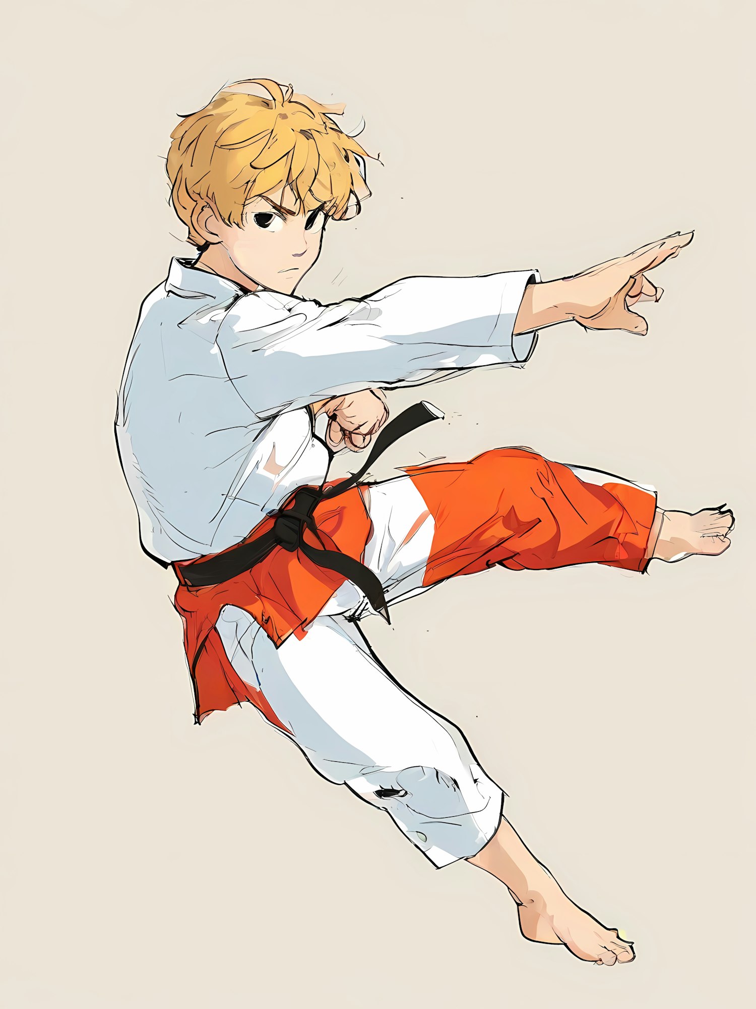 Dynamic illustration of a young martial artist in a high kick pose, wearing a white gi and black belt, with a focused expression.
