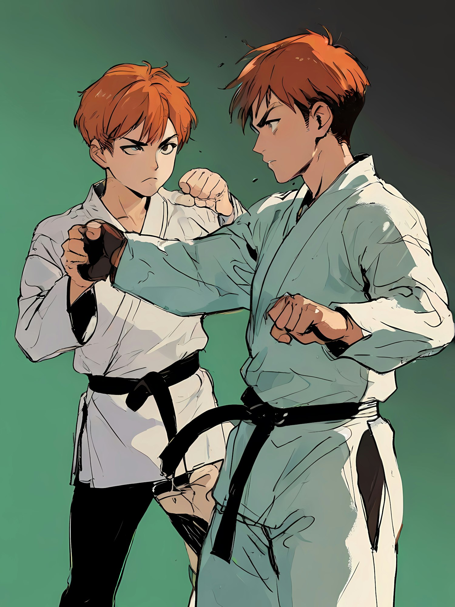 Two red-haired martial artists sparring in traditional gi with black belts, set against a dynamic green background.