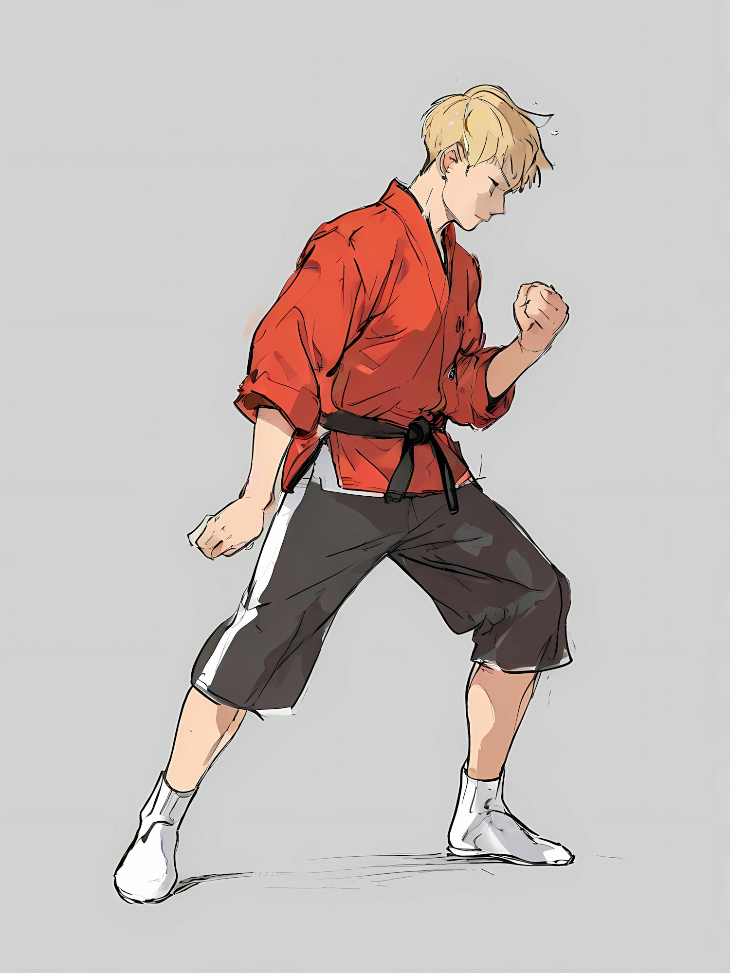 Illustration of a young martial artist in a red gi, black belt, and white socks, striking a focused pose against a gray background.