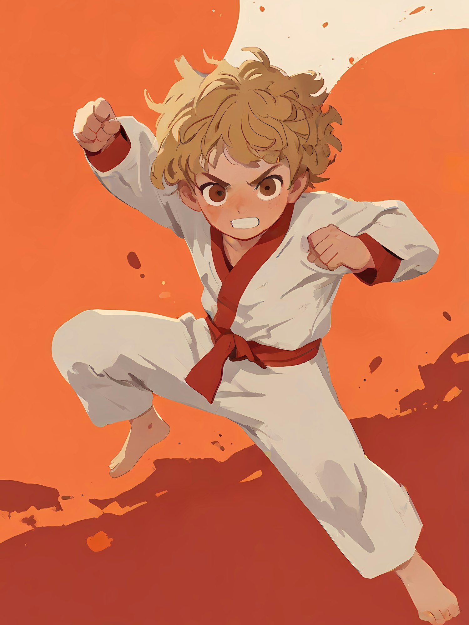 Dynamic illustration of a young martial artist in action, wearing a white uniform with a red belt against a vibrant orange background.