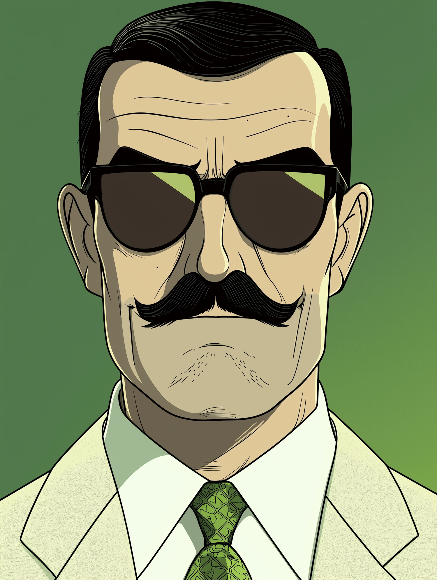 Stylized illustration of a man with a black mustache, sunglasses, cream suit, and green tie against a green background.