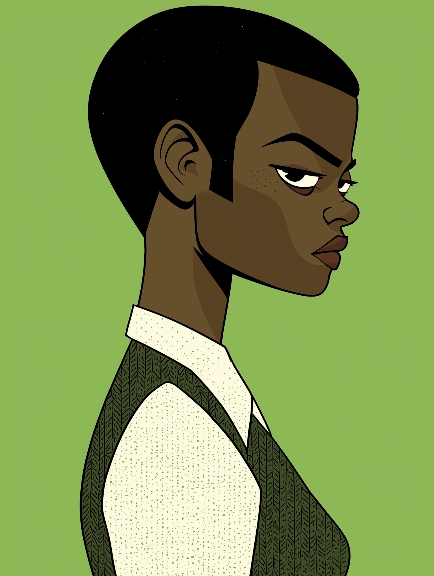 Stylized illustration of a person with short hair, wearing a green vest and white shirt, set against a vibrant green background.
