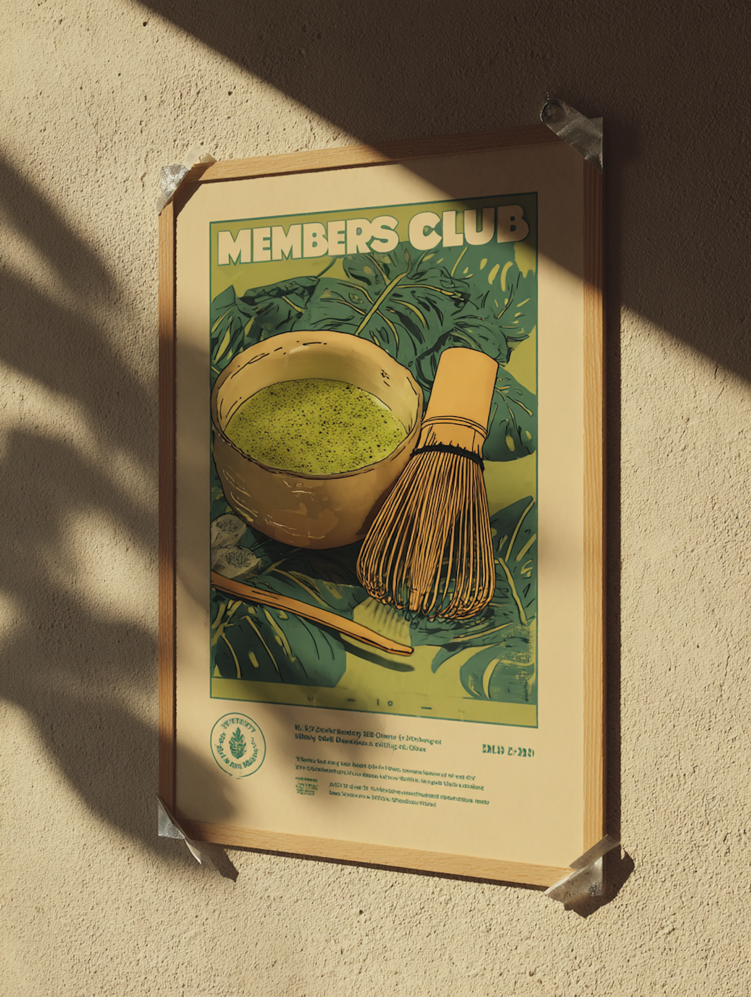 Framed poster of matcha tea and bamboo whisk with tropical leaves, bathed in warm sunlight, creating a cozy and organic vibe.