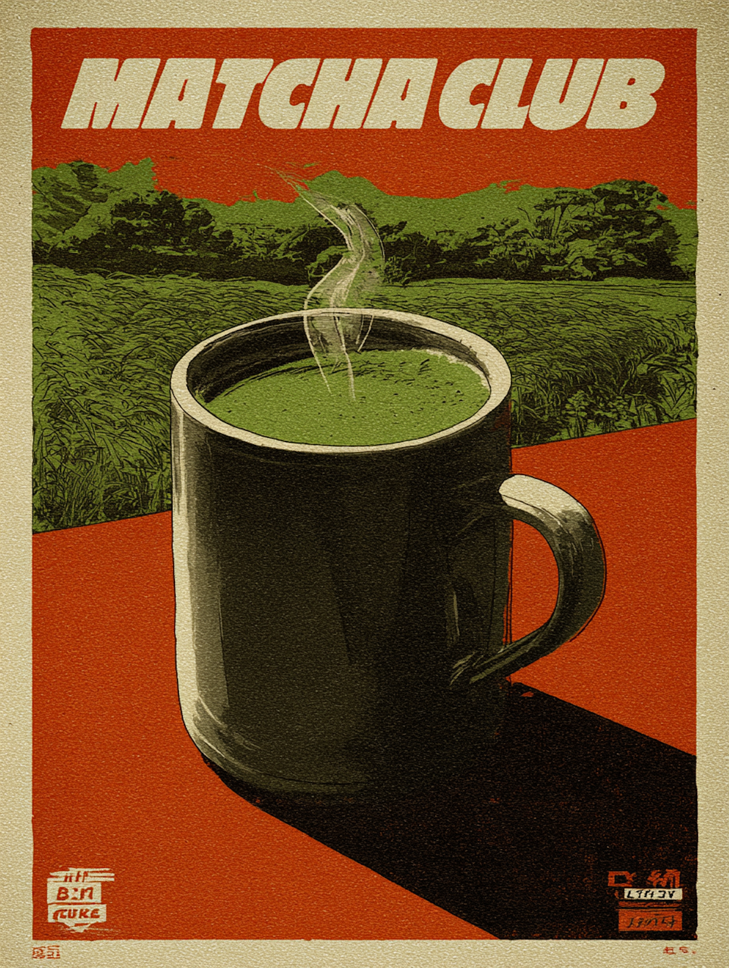 Retro-style illustration of a steaming matcha tea cup with bold colors and 'Matcha Club' text, evoking a vintage poster feel.