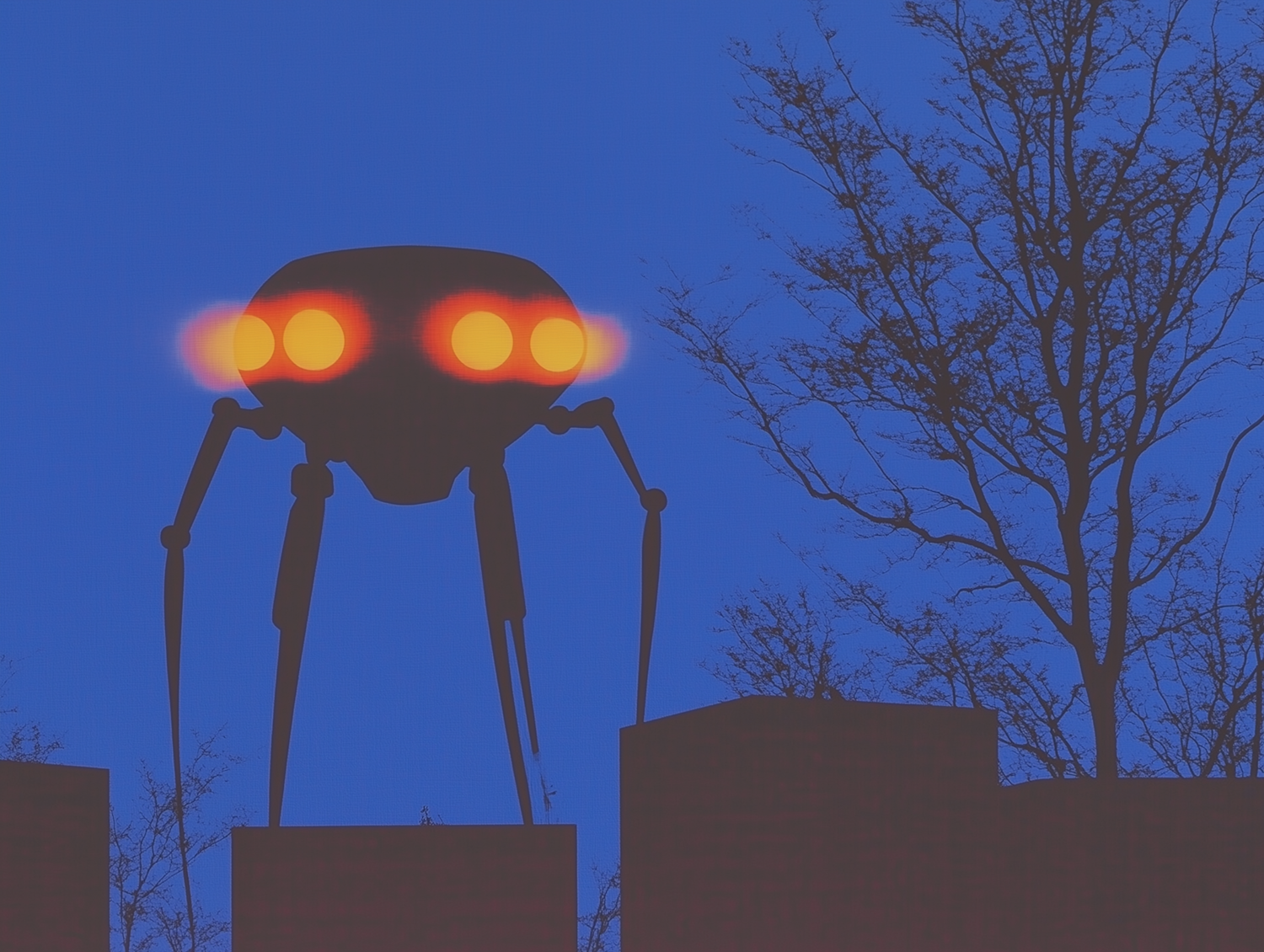 Silhouette of a mechanical creature with glowing eyes against a blue sky, creating an eerie sci-fi atmosphere.