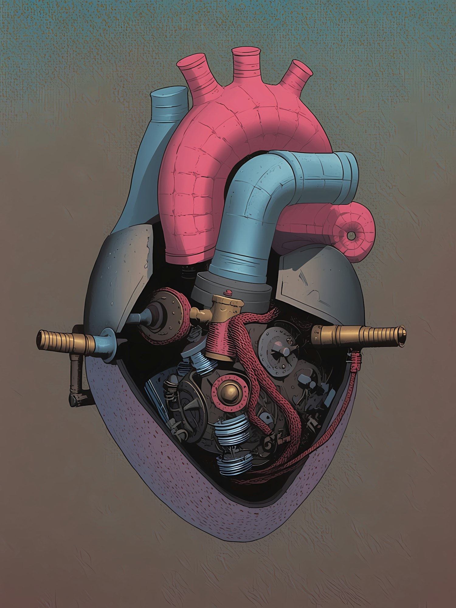A creative illustration of a human heart fused with mechanical components, blending anatomy and steampunk aesthetics in a unique design.