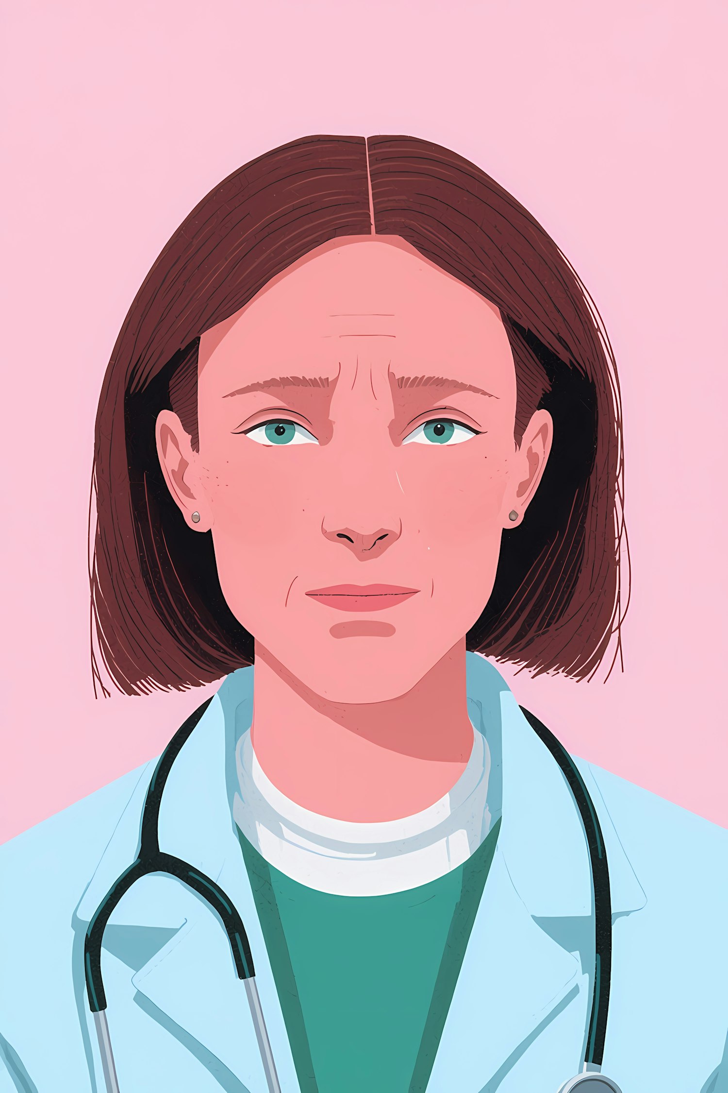 Illustration of a medical professional with short brown hair, wearing a stethoscope and a light blue coat, set against a pink background.