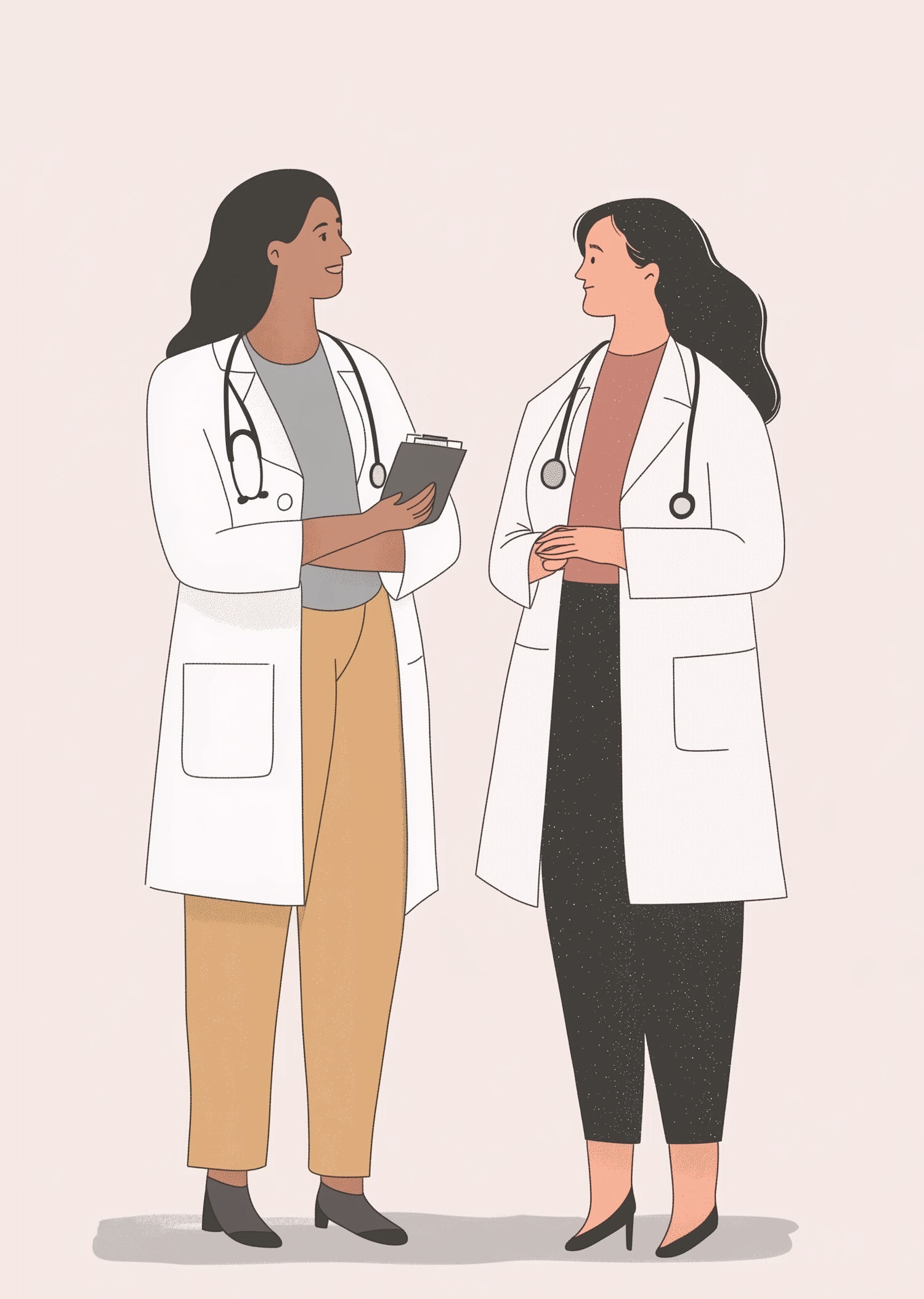 Illustration of two female doctors in lab coats discussing with stethoscopes, symbolizing collaboration in healthcare.