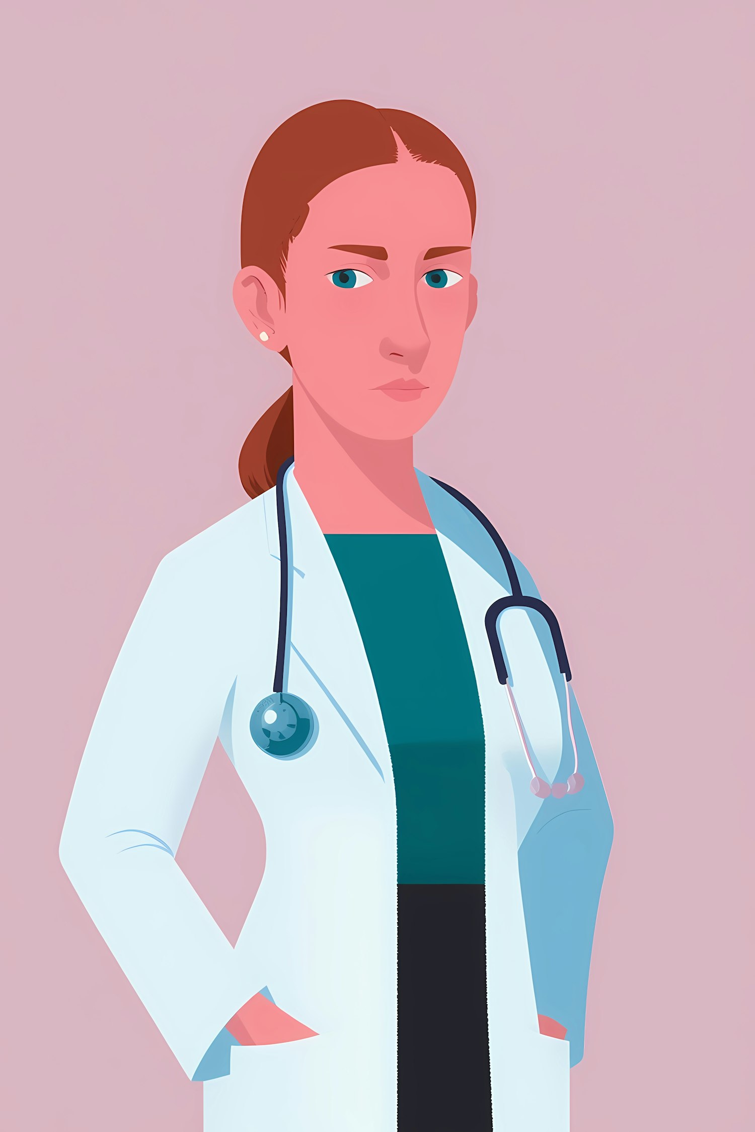 Illustration of a medical professional with a stethoscope, wearing a white coat, set against a pastel background.