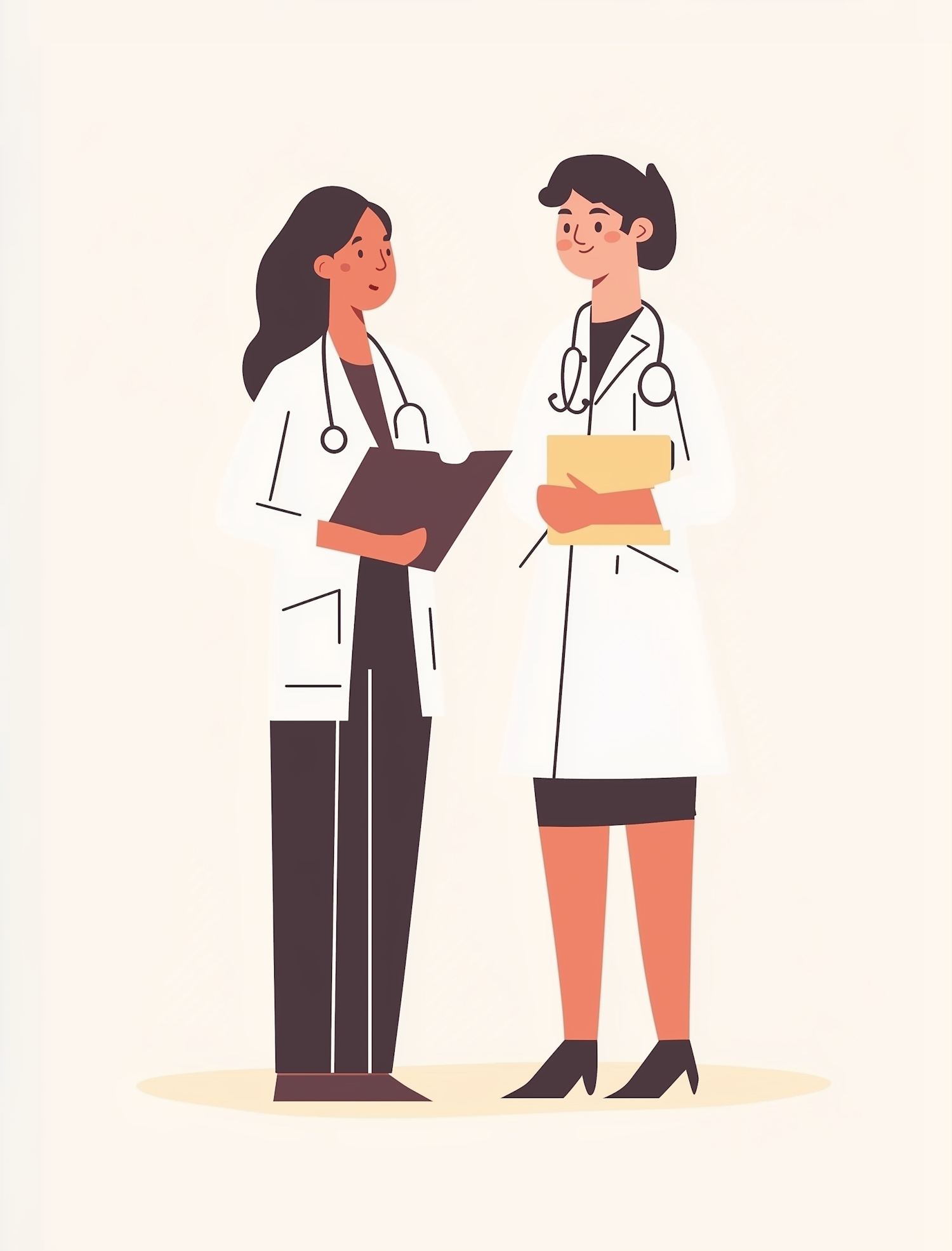 Illustration of two doctors in white coats discussing with clipboards and stethoscopes, set against a light beige background.