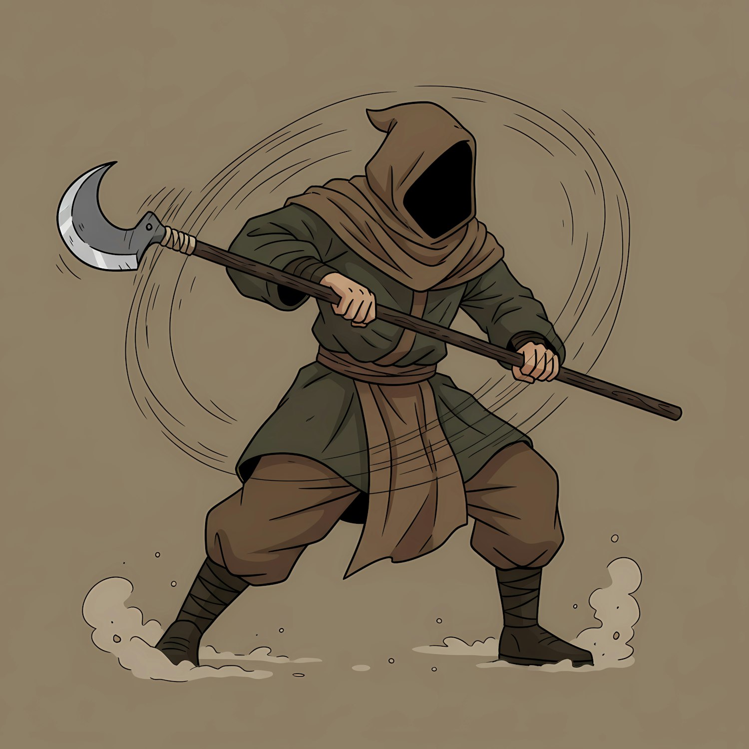 Dynamic illustration of a hooded figure in medieval attire wielding a crescent-bladed polearm, set against a plain background.
