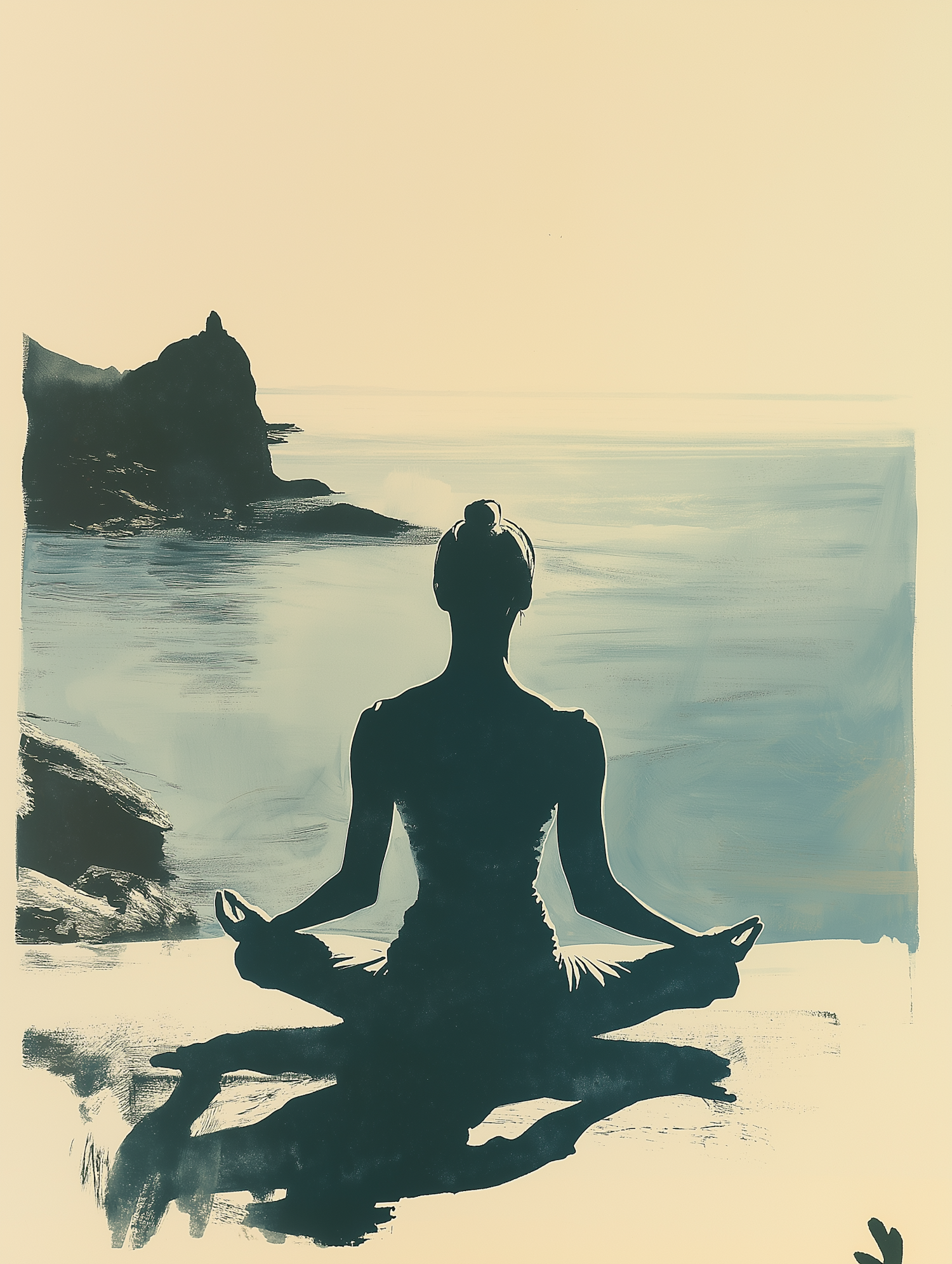 Peaceful illustration of a person meditating by the sea, silhouetted against a calm ocean and rocky outcrop. Perfect for mindfulness themes.