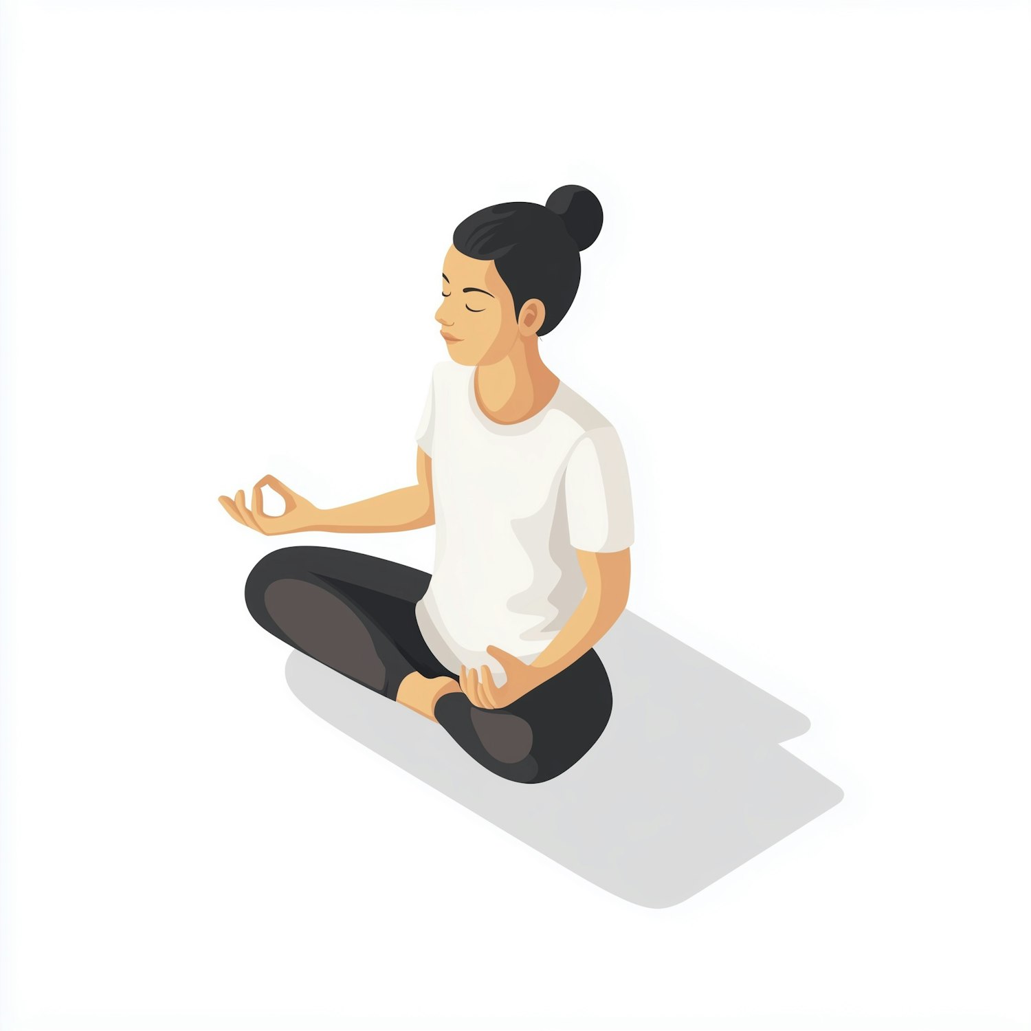 Minimalist illustration of a person meditating cross-legged, wearing a white t-shirt and black leggings, on a clean white background.