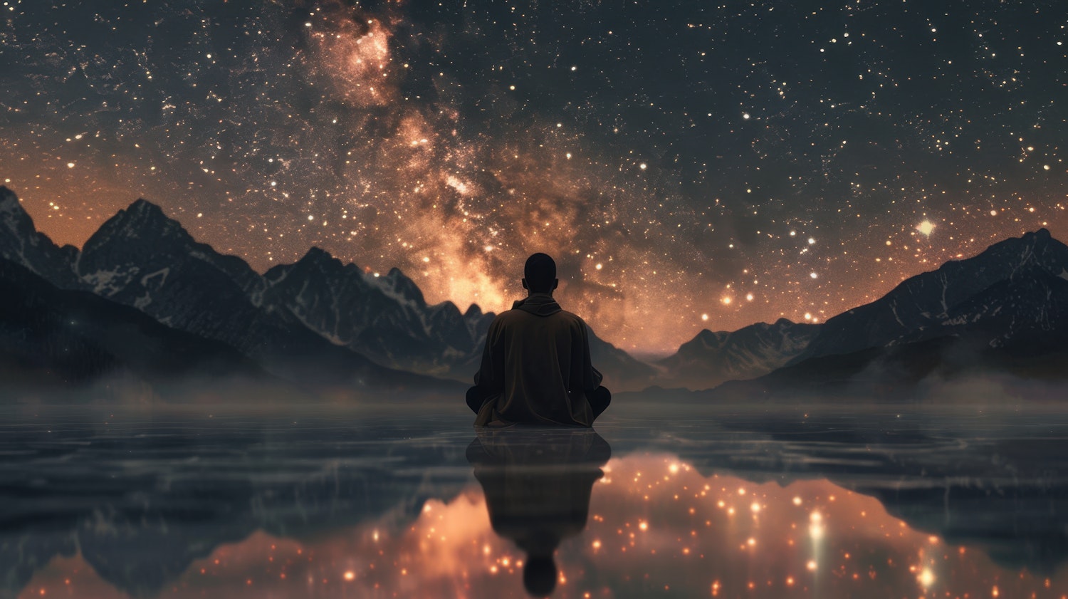 A person meditates on a reflective surface under a starry sky with the Milky Way, surrounded by mountains. Tranquil and mystical scene.