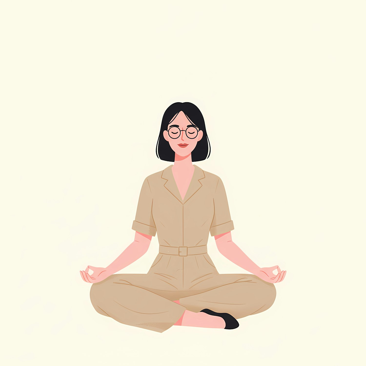 Illustration of a person meditating in a beige outfit, sitting cross-legged with a serene expression, on a light background.