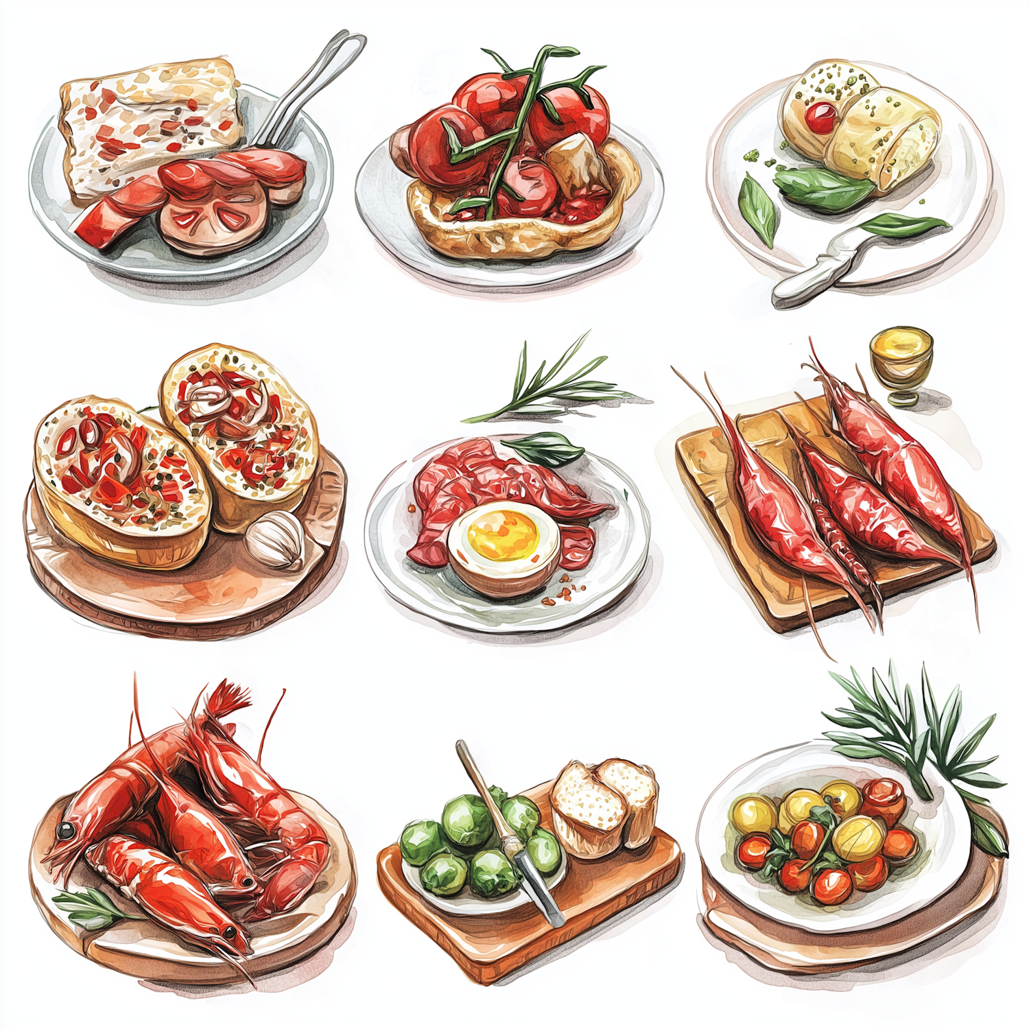 A colorful illustration of Mediterranean dishes like bruschetta, prawns, olives, and tomatoes, perfect for food lovers and culinary inspiration.
