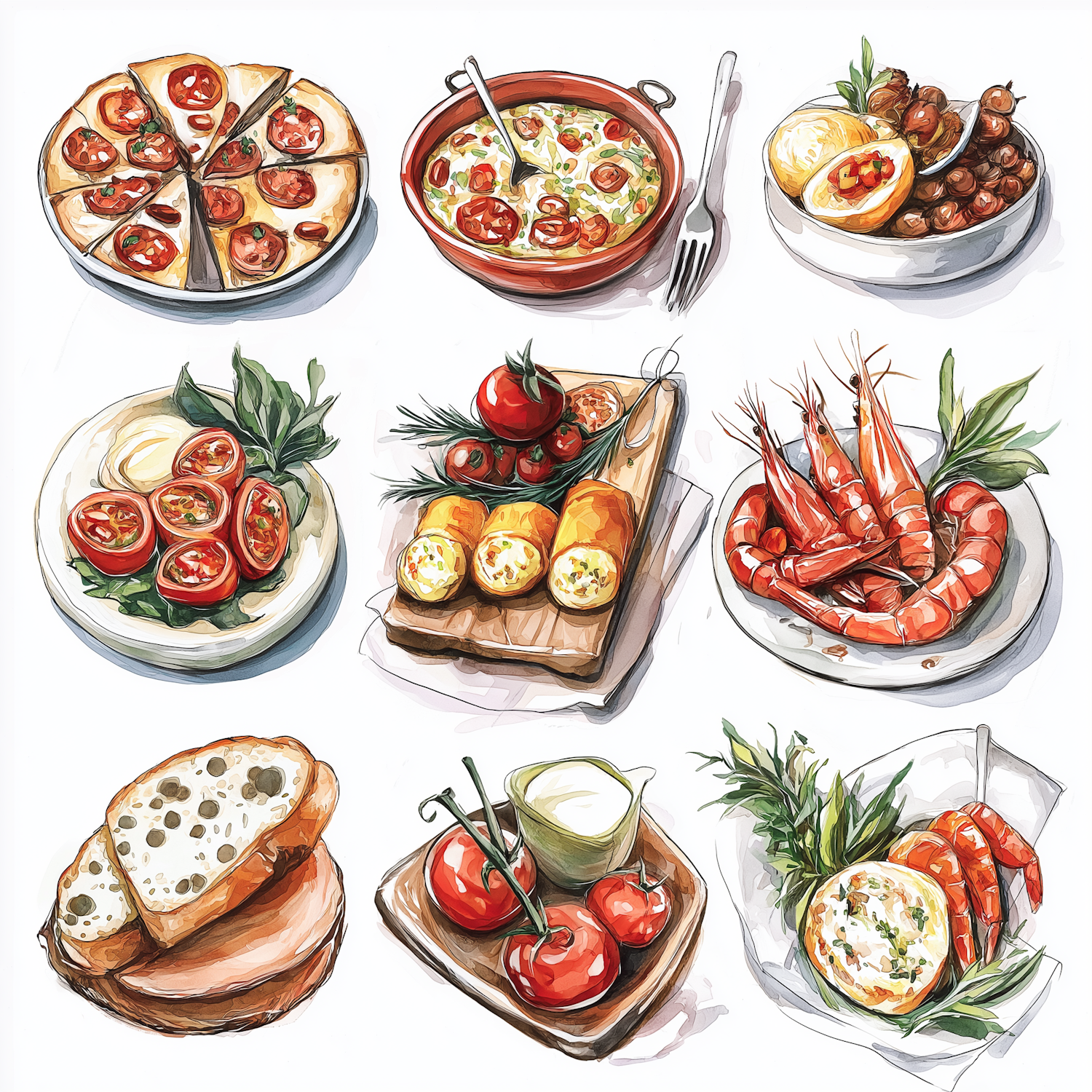 A colorful illustration of Mediterranean dishes, including pizza, prawns, stuffed tomatoes, and more, perfect for food lovers.