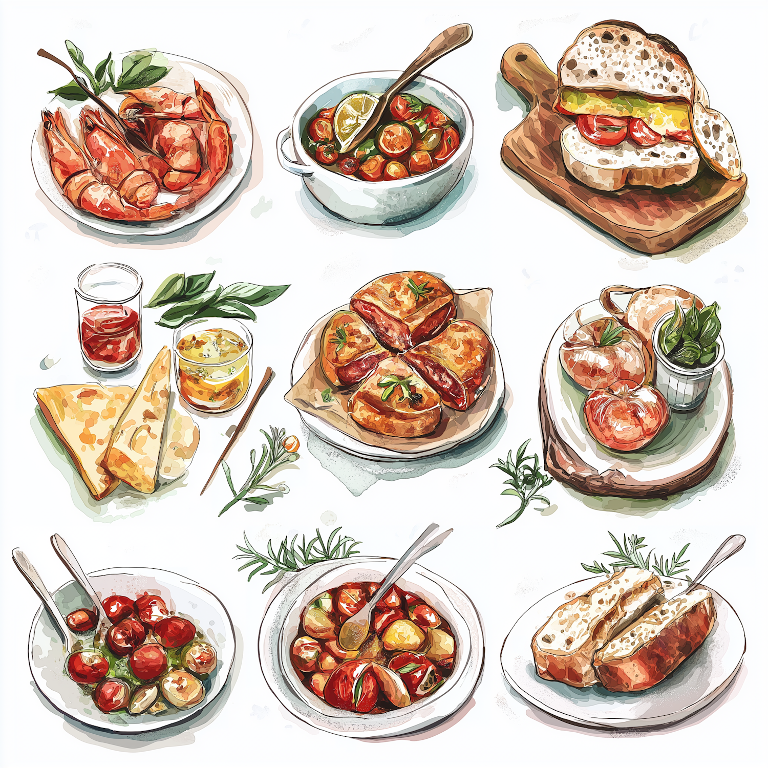 A colorful illustration of Mediterranean dishes like shrimp, tomato soup, stuffed bread, and marinated veggies, perfect for food lovers.