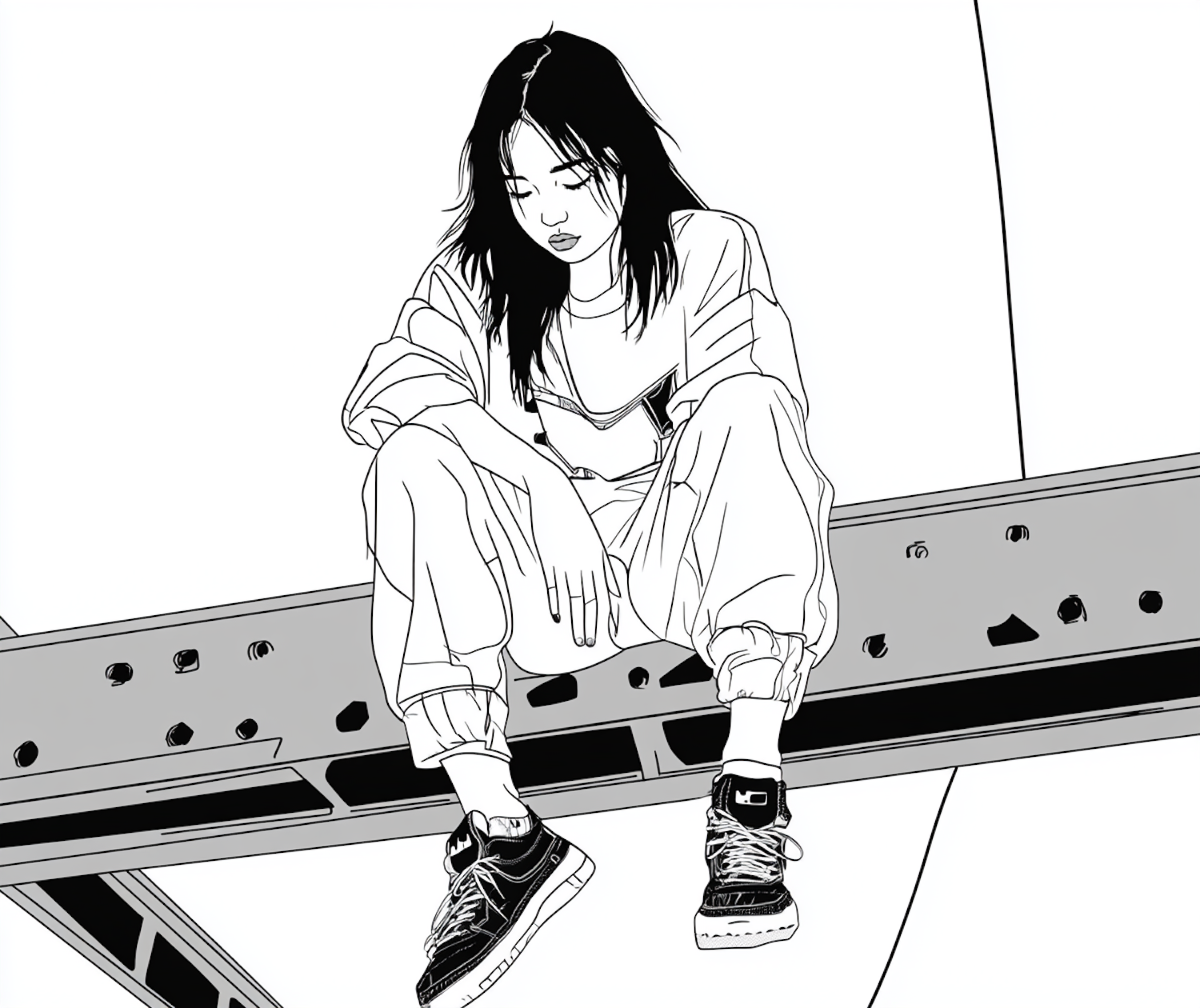 Black and white illustration of a young woman sitting on a steel beam, wearing casual clothes and sneakers, with a relaxed expression.