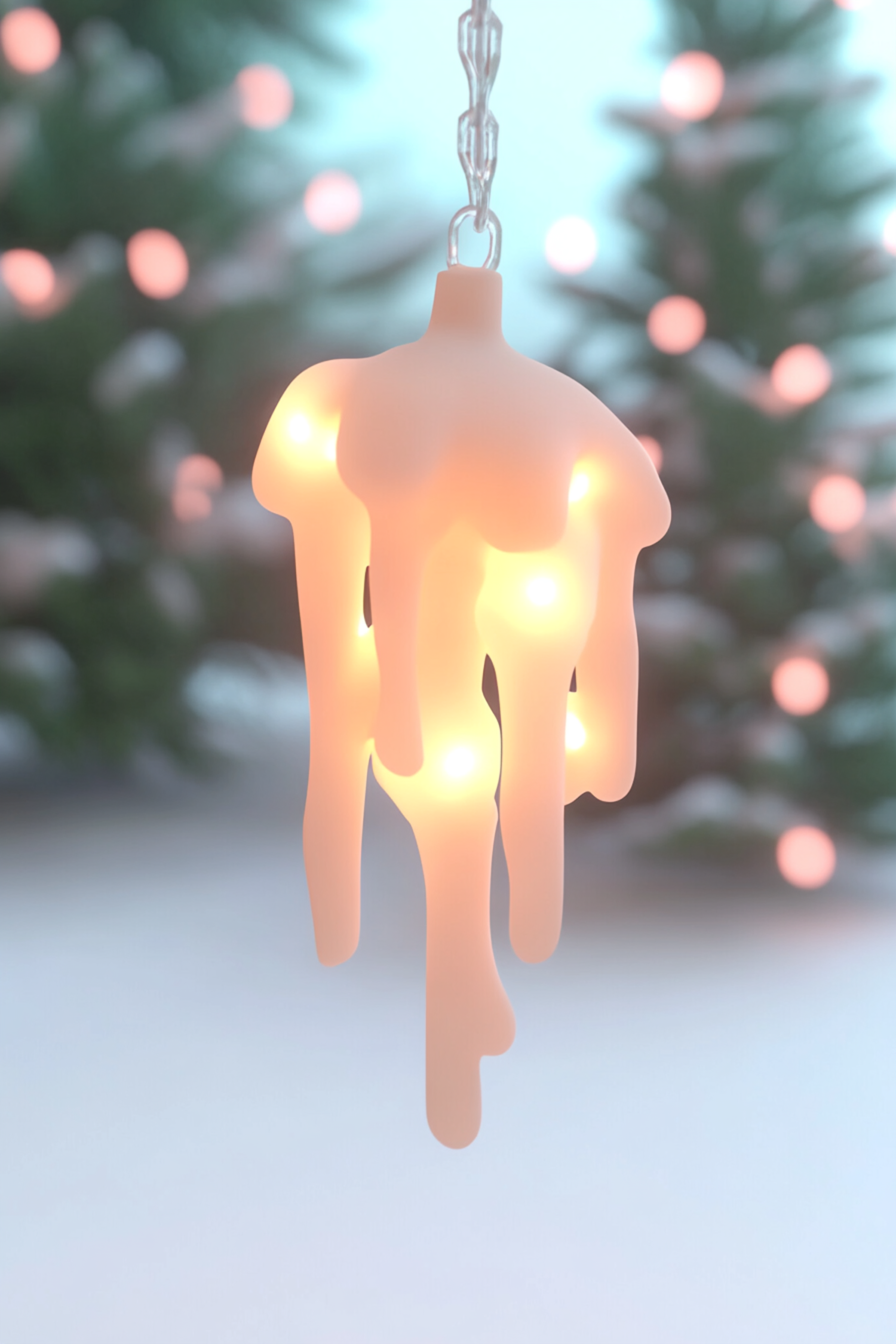 Artistic light fixture resembling melting wax, glowing warmly in a festive setting with blurred holiday lights in the background.