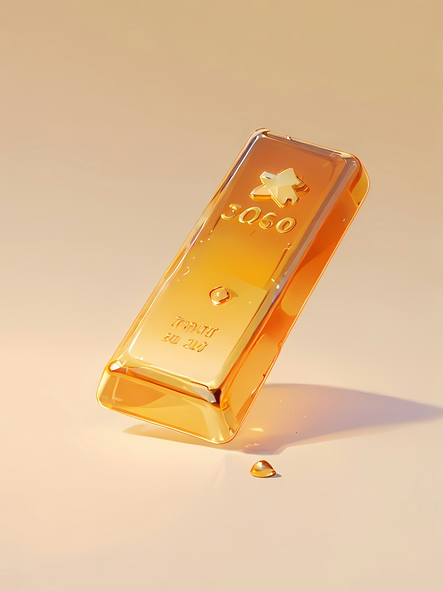 A glossy gold bar with a star emblem and '3060' engraving, melting slightly in a warm, golden-toned minimalistic setting.