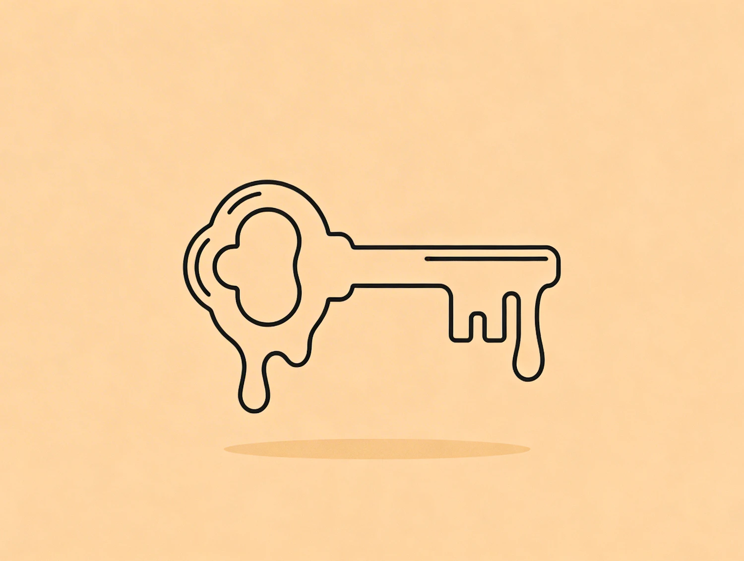 Minimalist illustration of a melting key on a beige background, combining simplicity with a surreal artistic touch.