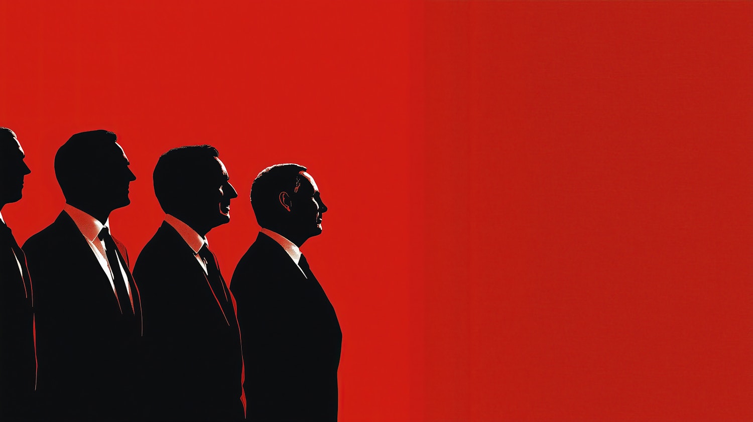 Minimalist illustration of four men in suits in profile against a bold red background, emphasizing contrast and simplicity.