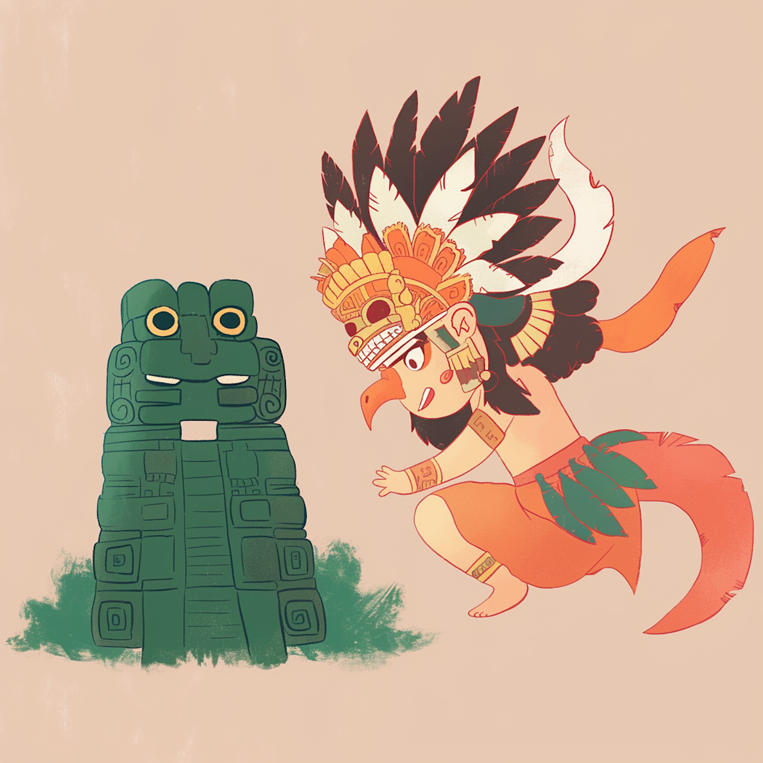Cartoon of an Aztec character with a feathered headdress interacting with a green stone statue, set against a beige background.