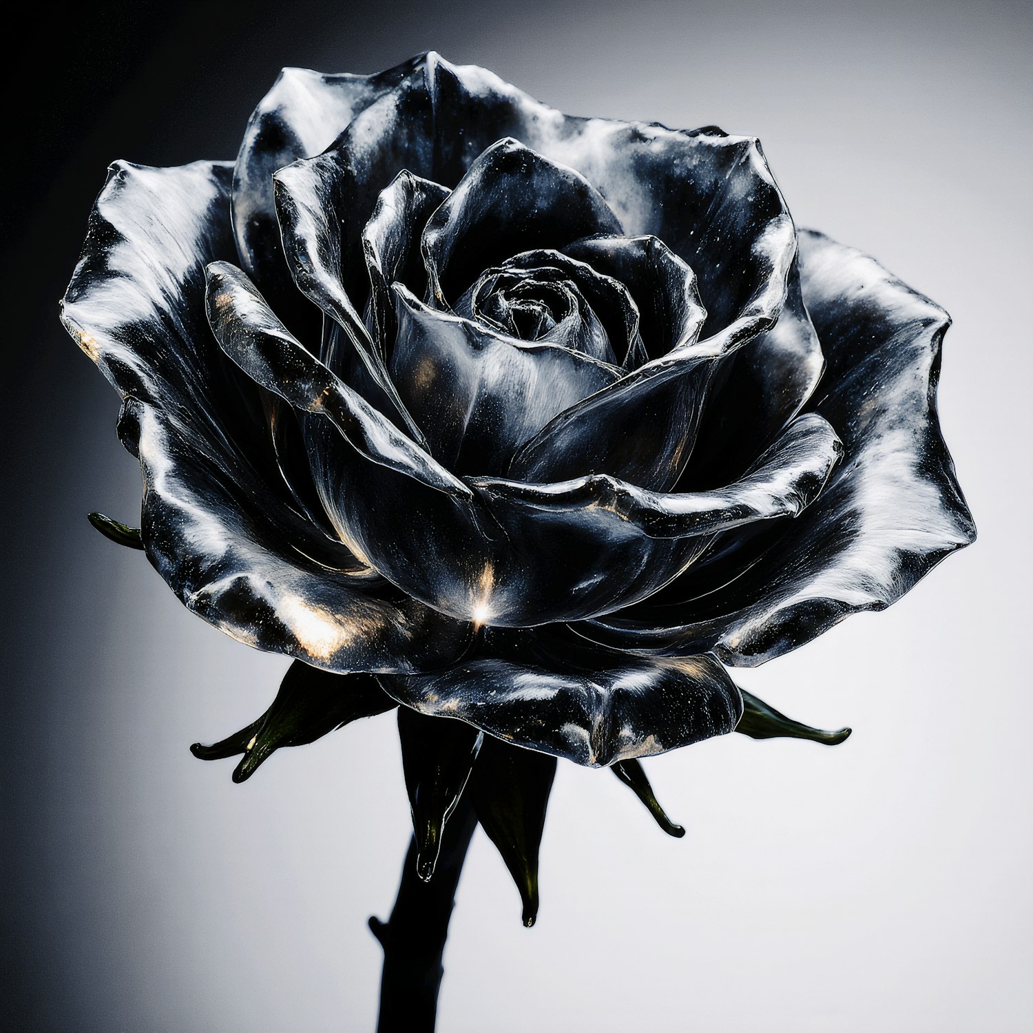A stunning metallic black rose with intricate details and a glossy finish, set against a gradient gray background for a dramatic effect.