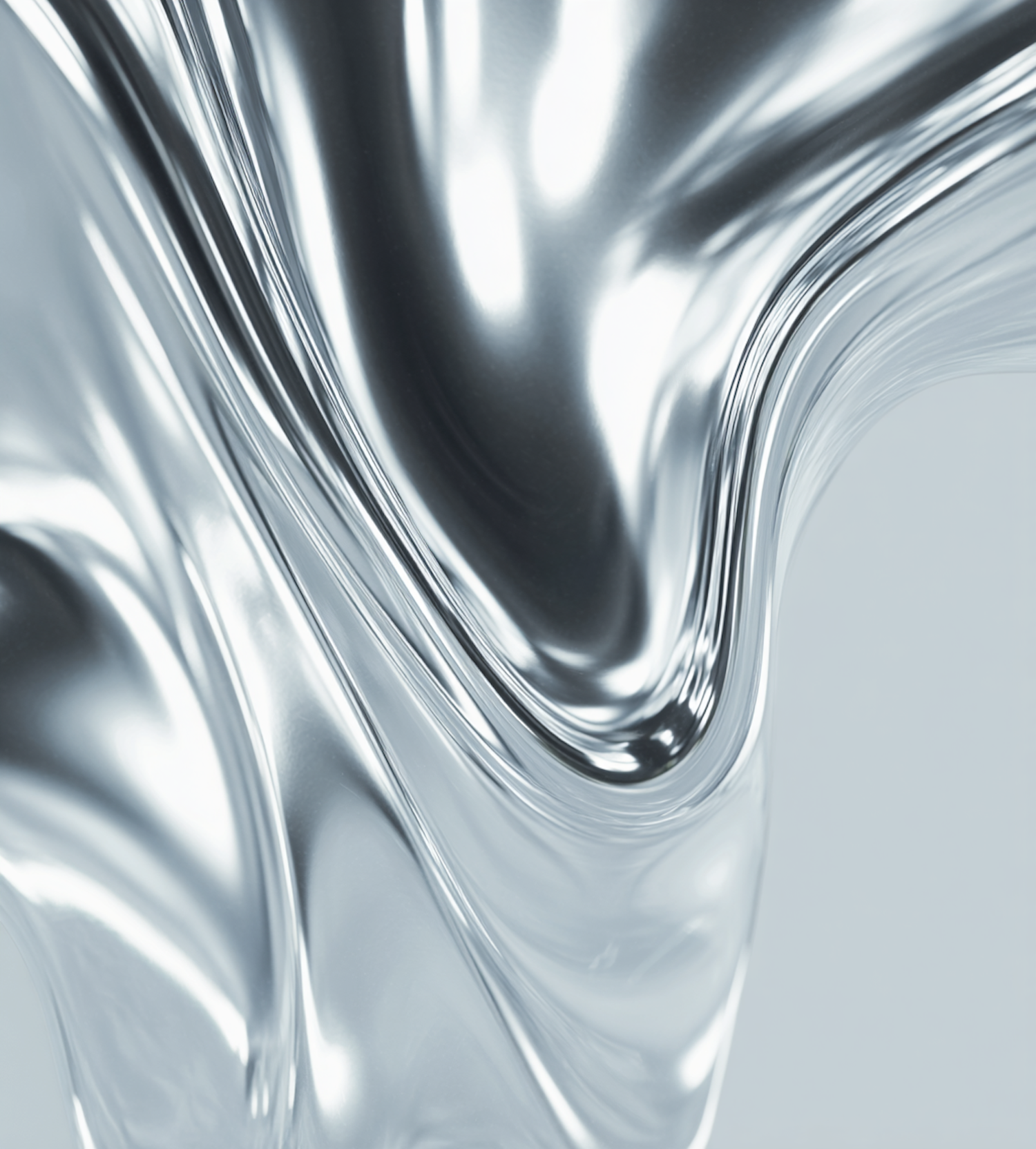 A dynamic abstract flow of silver-like material with smooth curves and reflective highlights on a pale gray backdrop.