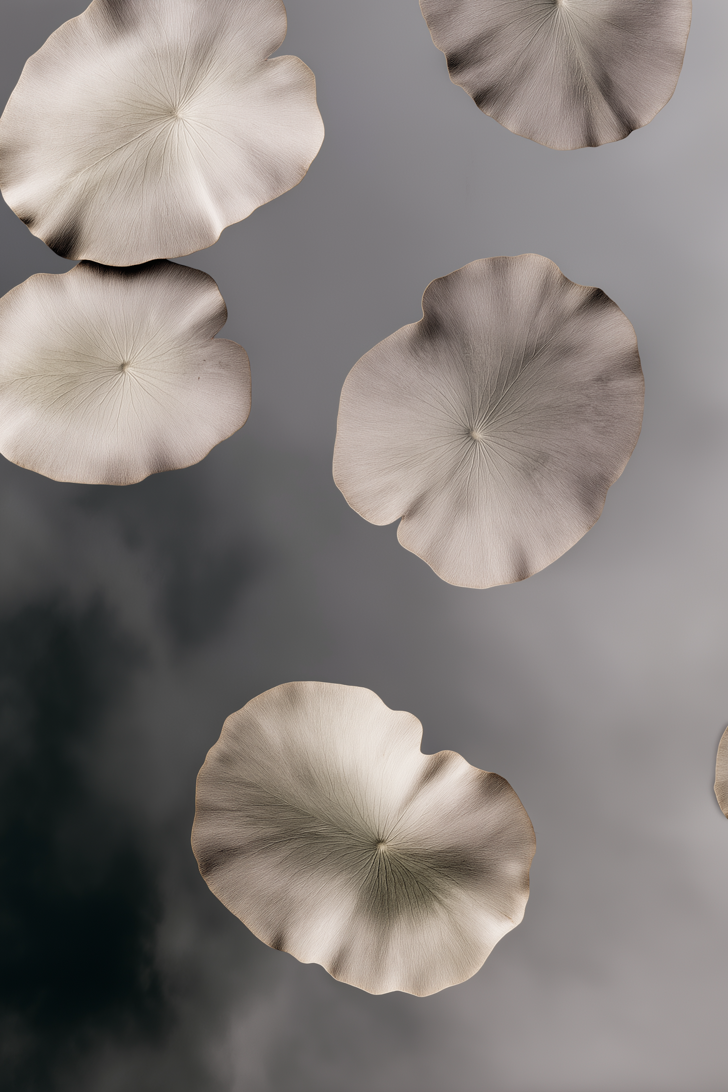 Elegant metallic lily pad-like shapes float on a soft gray background, creating a serene and minimalistic aesthetic.