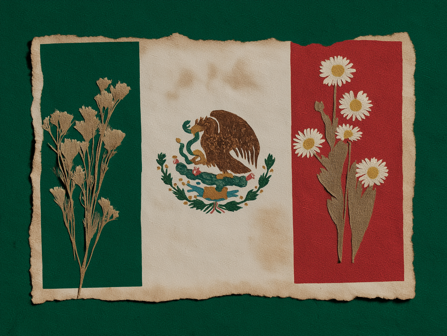 Artistic Mexican flag on aged parchment with dried flowers and a rustic design, featuring the iconic eagle emblem. Perfect for cultural themes.