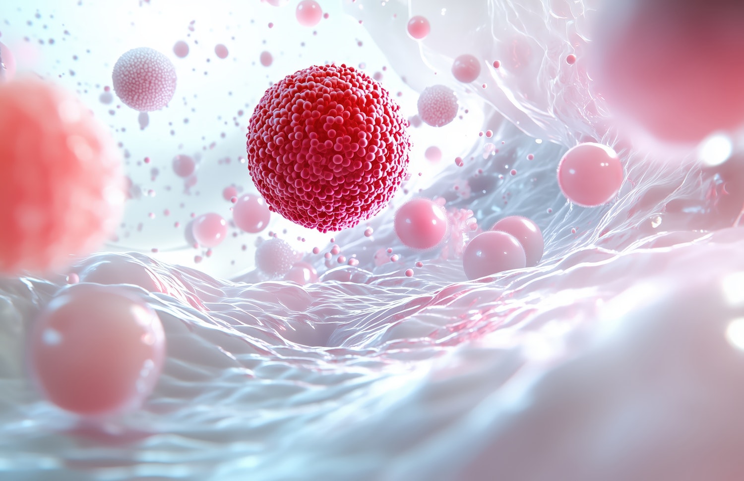 A vibrant 3D rendering of a microscopic biological scene with a red spherical structure and pink particles in a glowing fluid environment.