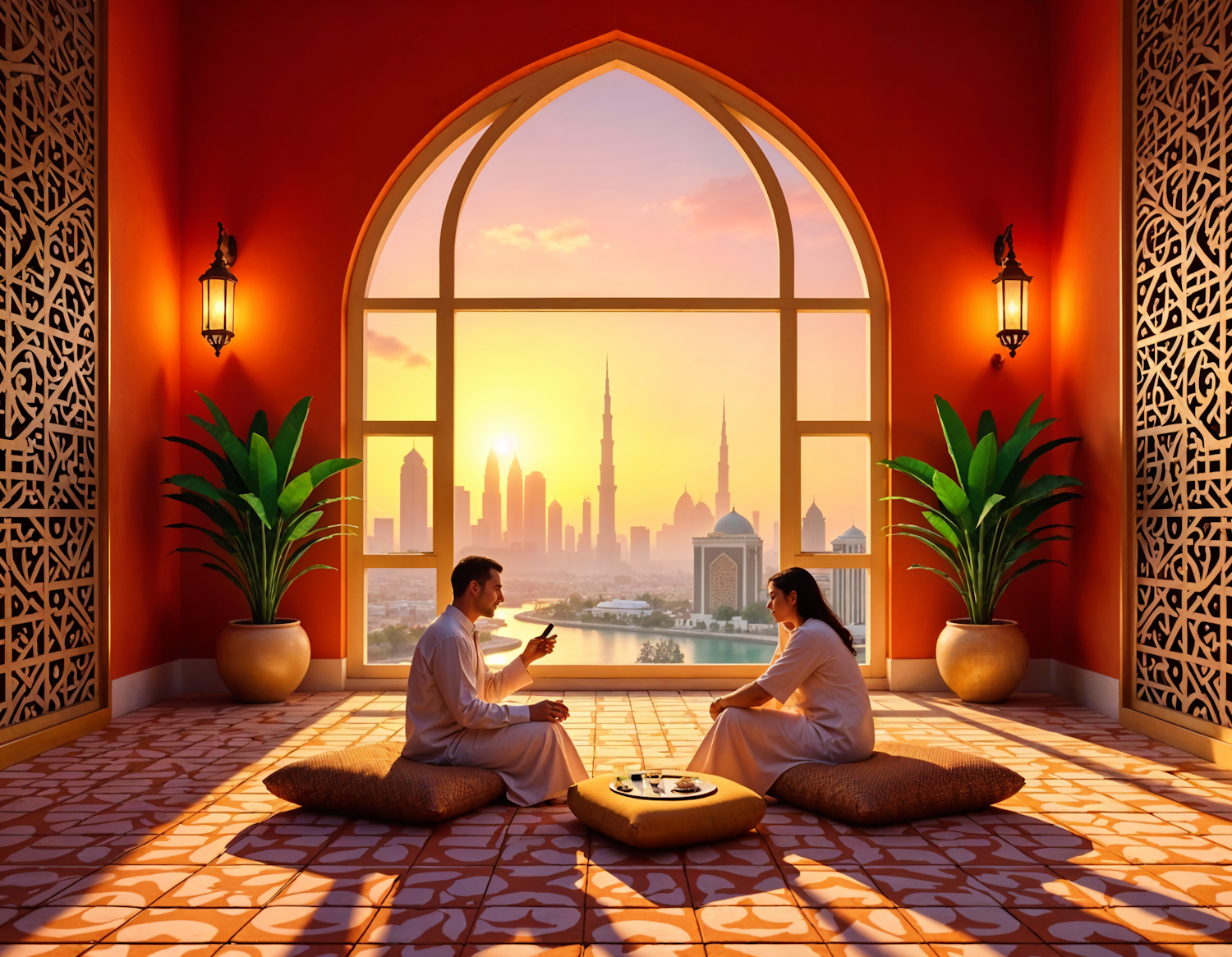 A peaceful Middle Eastern-inspired room with a cityscape view, where two people share a moment over refreshments at sunset.