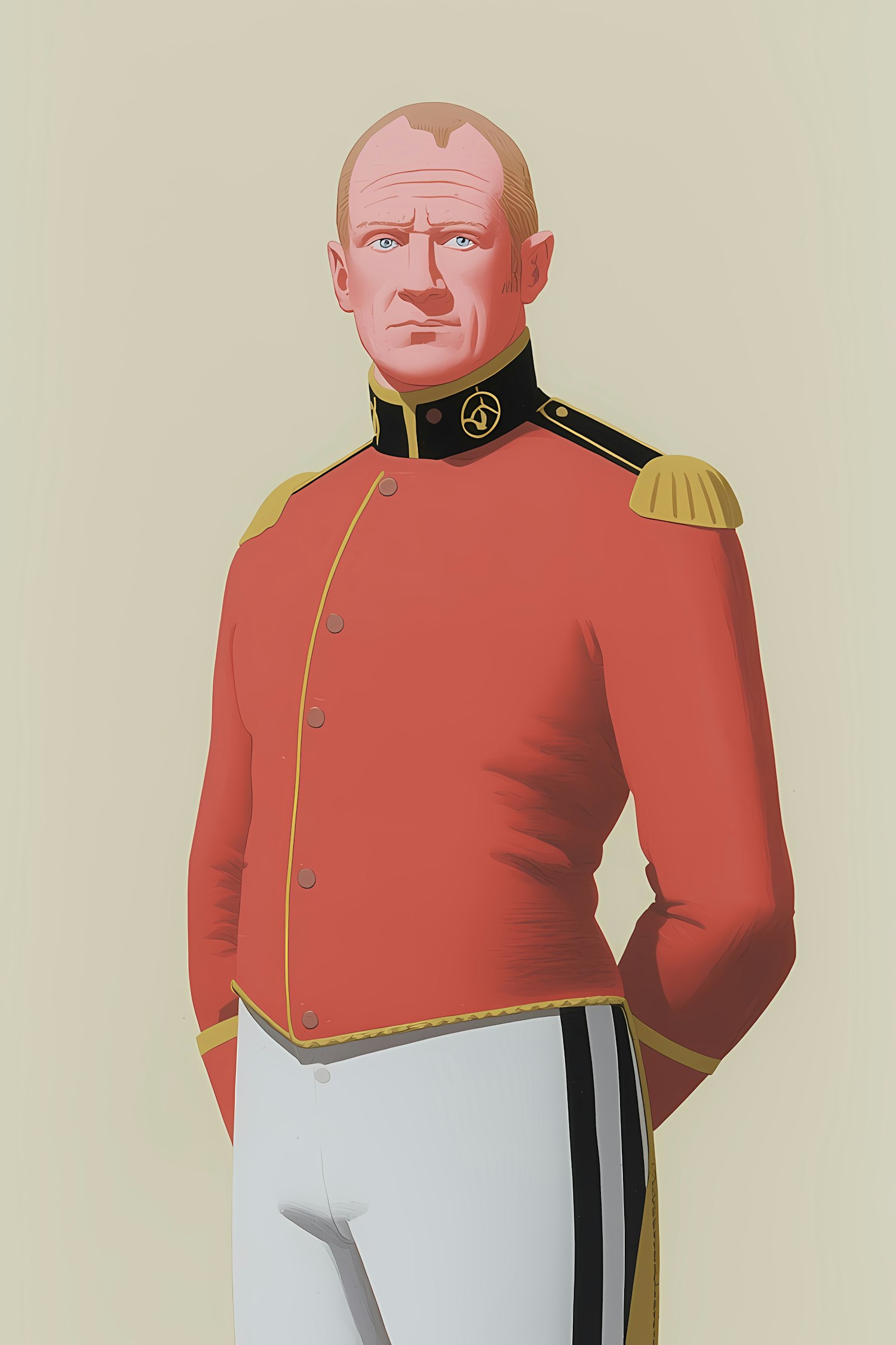 Stylized illustration of a man in a red military uniform with gold accents, standing against a neutral background.