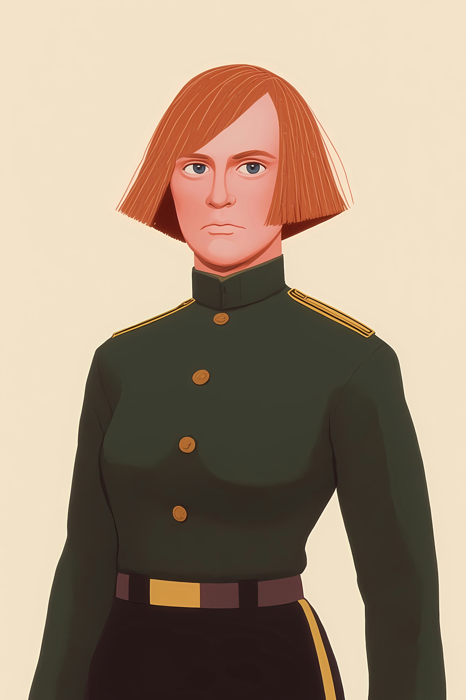 Stylized illustration of a person in a green military-style uniform with gold accents, set against a plain beige background.