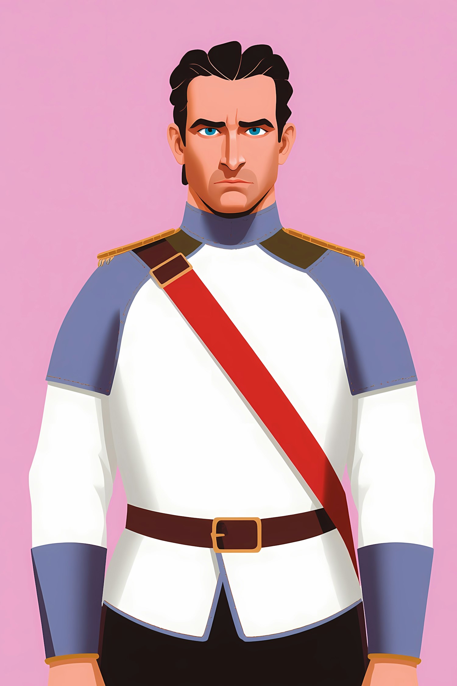 Illustration of a man in a formal military-style uniform with a pink background, featuring a red sash and gold epaulets.