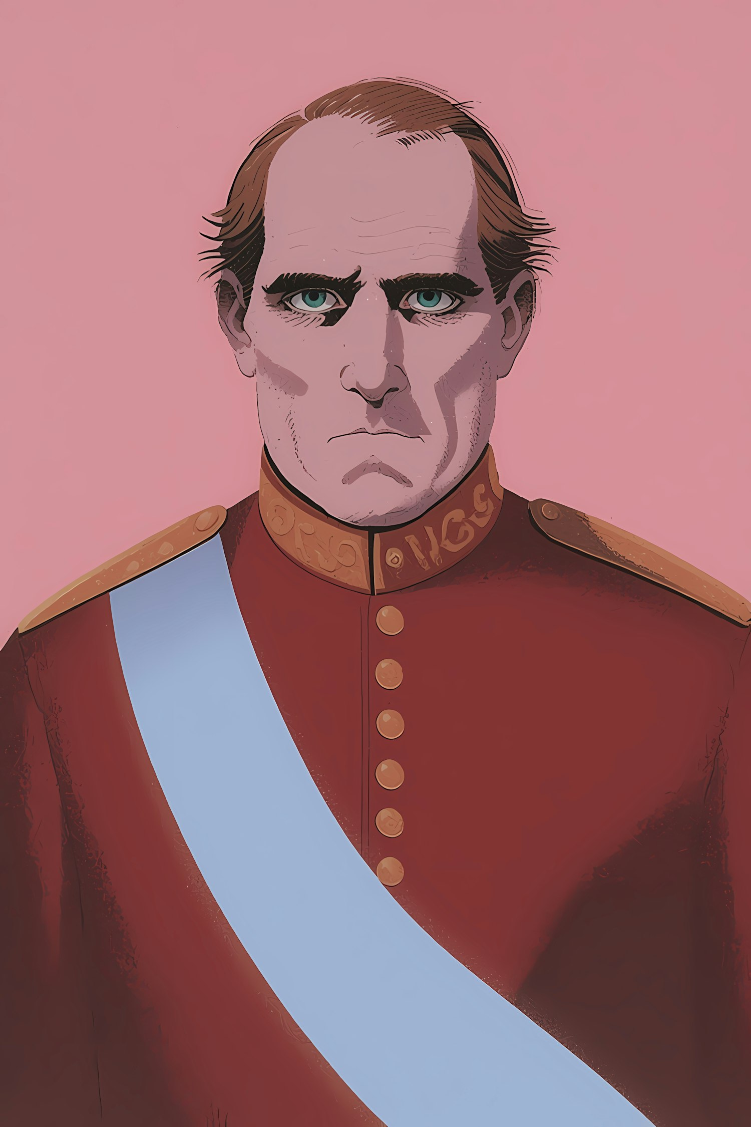 Stylized illustration of a serious individual in a red military uniform with gold accents and a blue sash, set against a pink background.